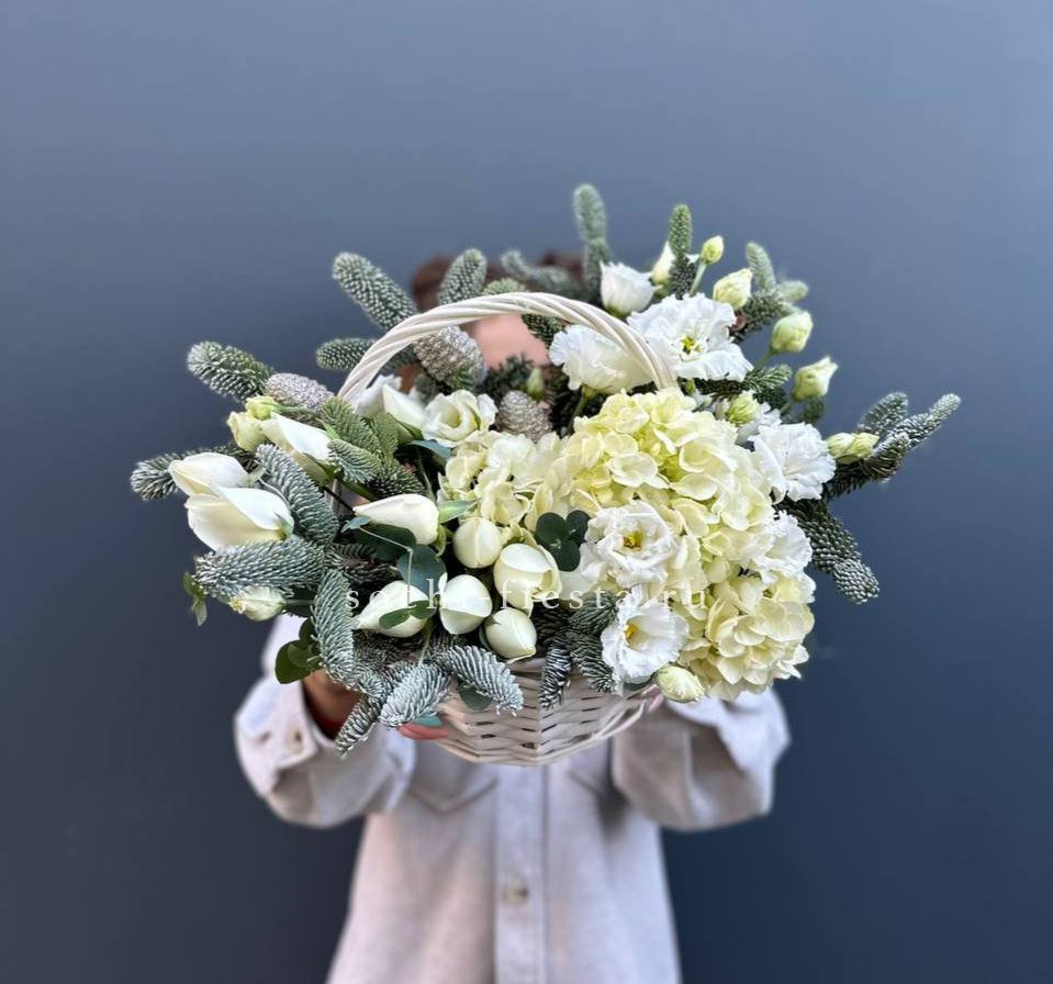Белоснежные розы и эустома соседствуют с воздушными соцветиями гортензии среди хвойных веток. Корзина объединяет цветочную свежесть и праздничную атмосферу в удобной форме.