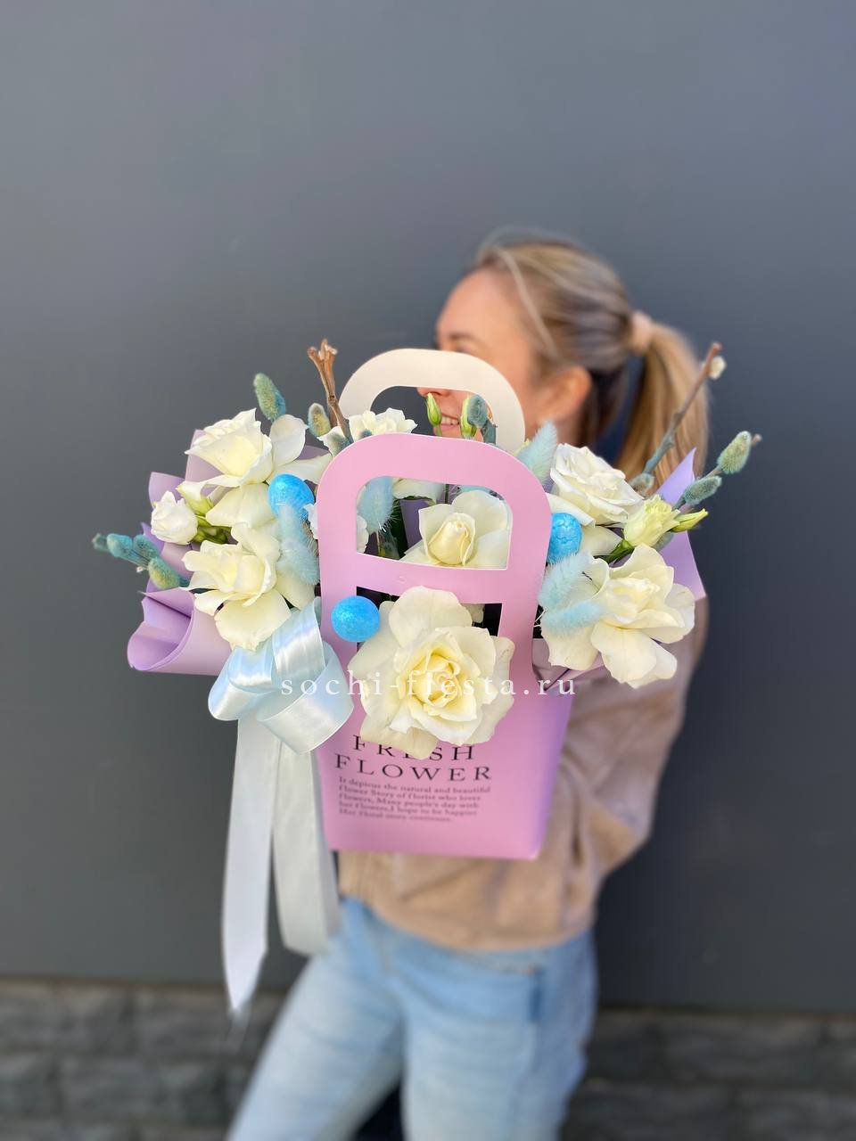 Белые розы собраны в компактную форму вместе с пушистым лагурусом и вербными ветками. Пасхальные яйца встроены в композицию как часть весеннего настроения. Сумочка удобна для размещения на столе.
