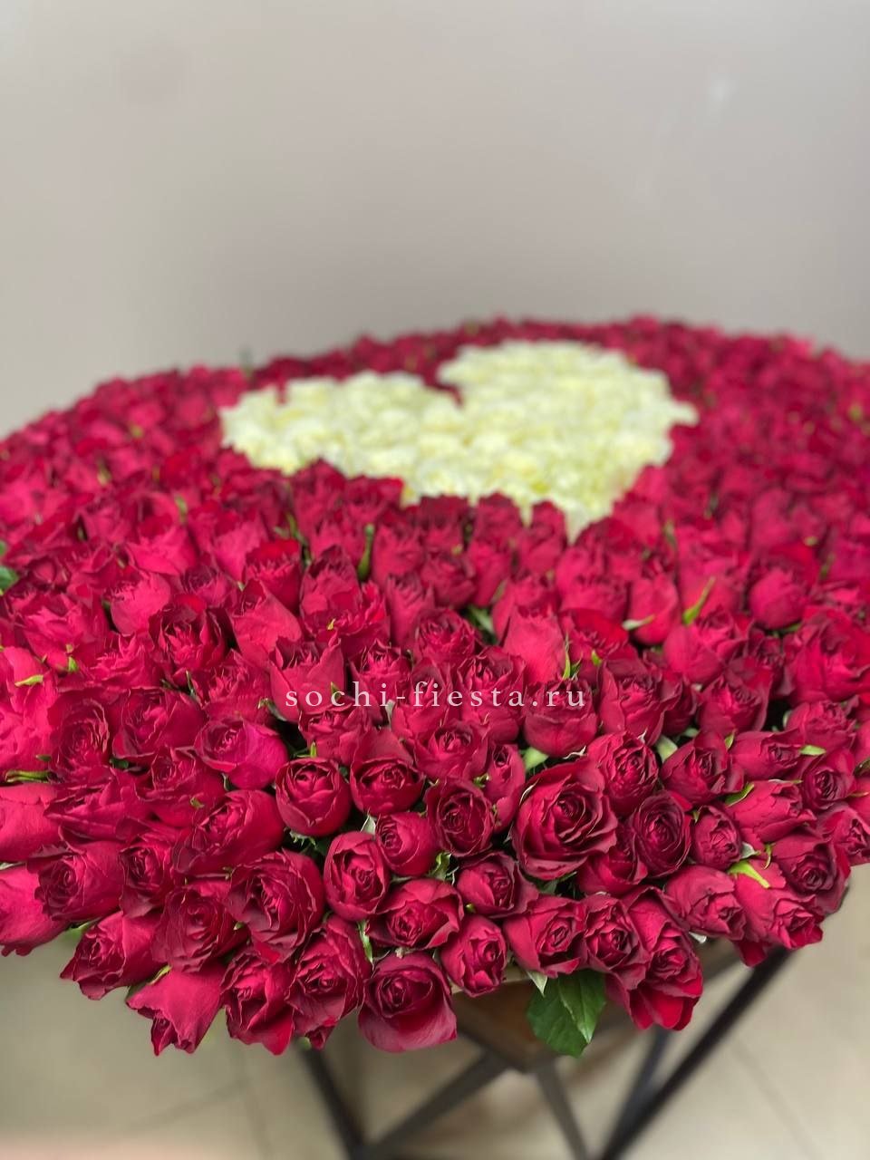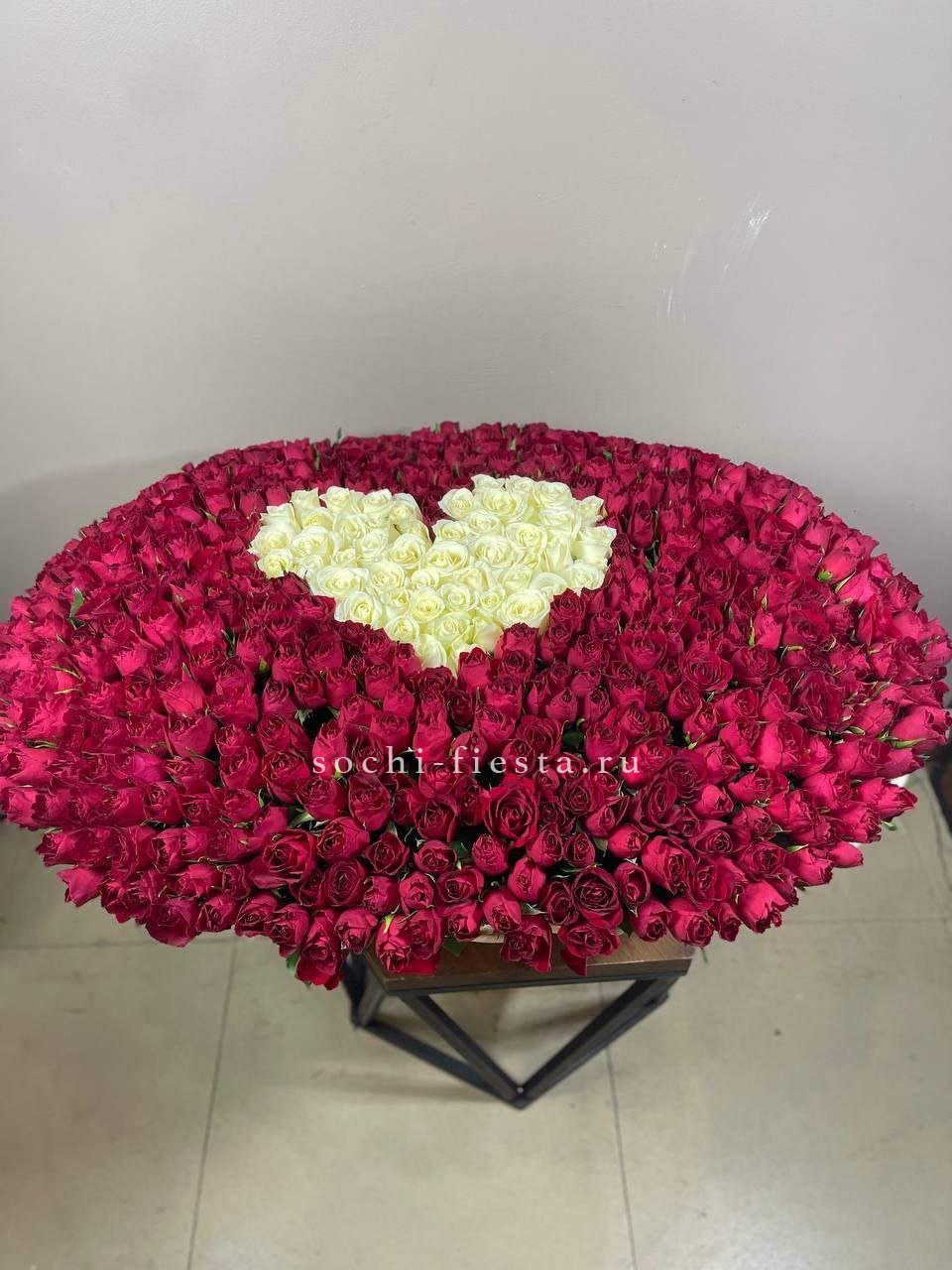 Пятьсот одна роза образует форму сердца из белых и красных бутонов. Плотная композиция в корзине удерживает симметрию и объём без дополнительных конструкций. Готовое решение для выражения чувств в масштабной форме.