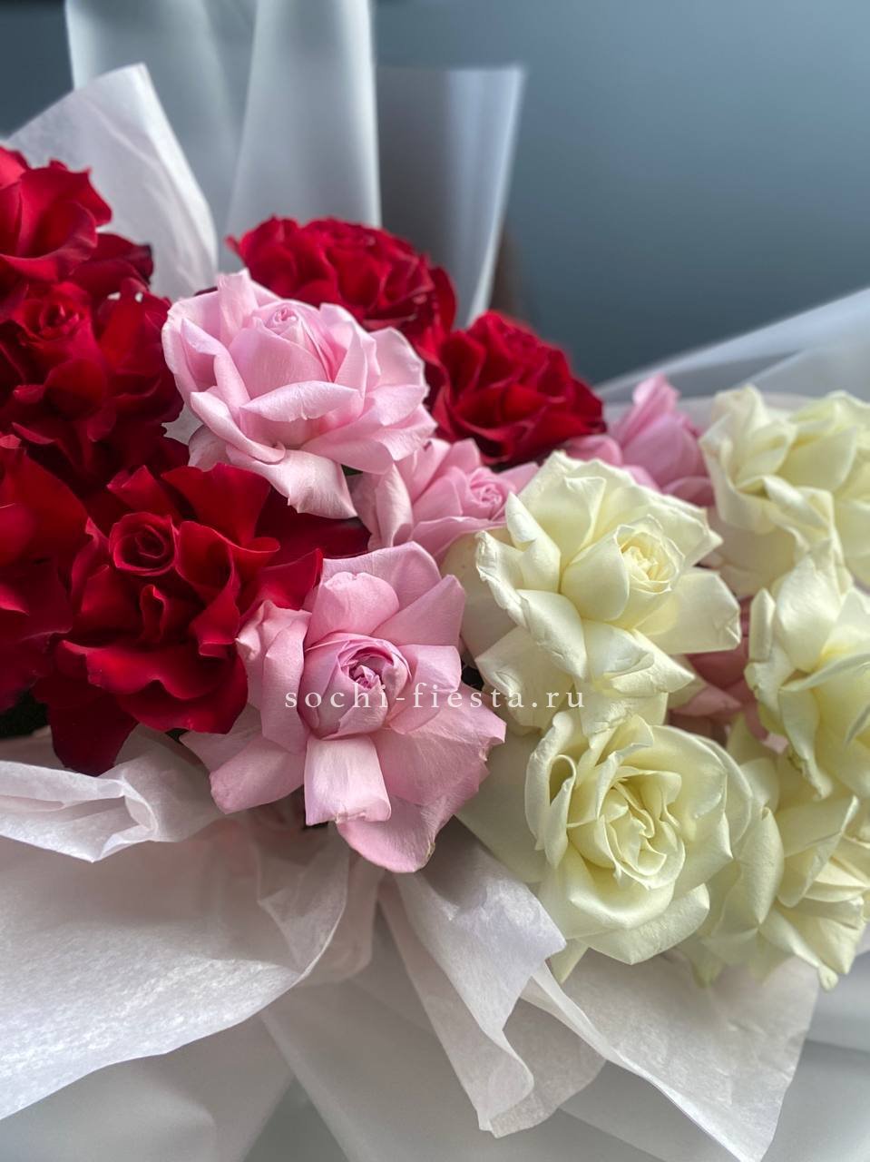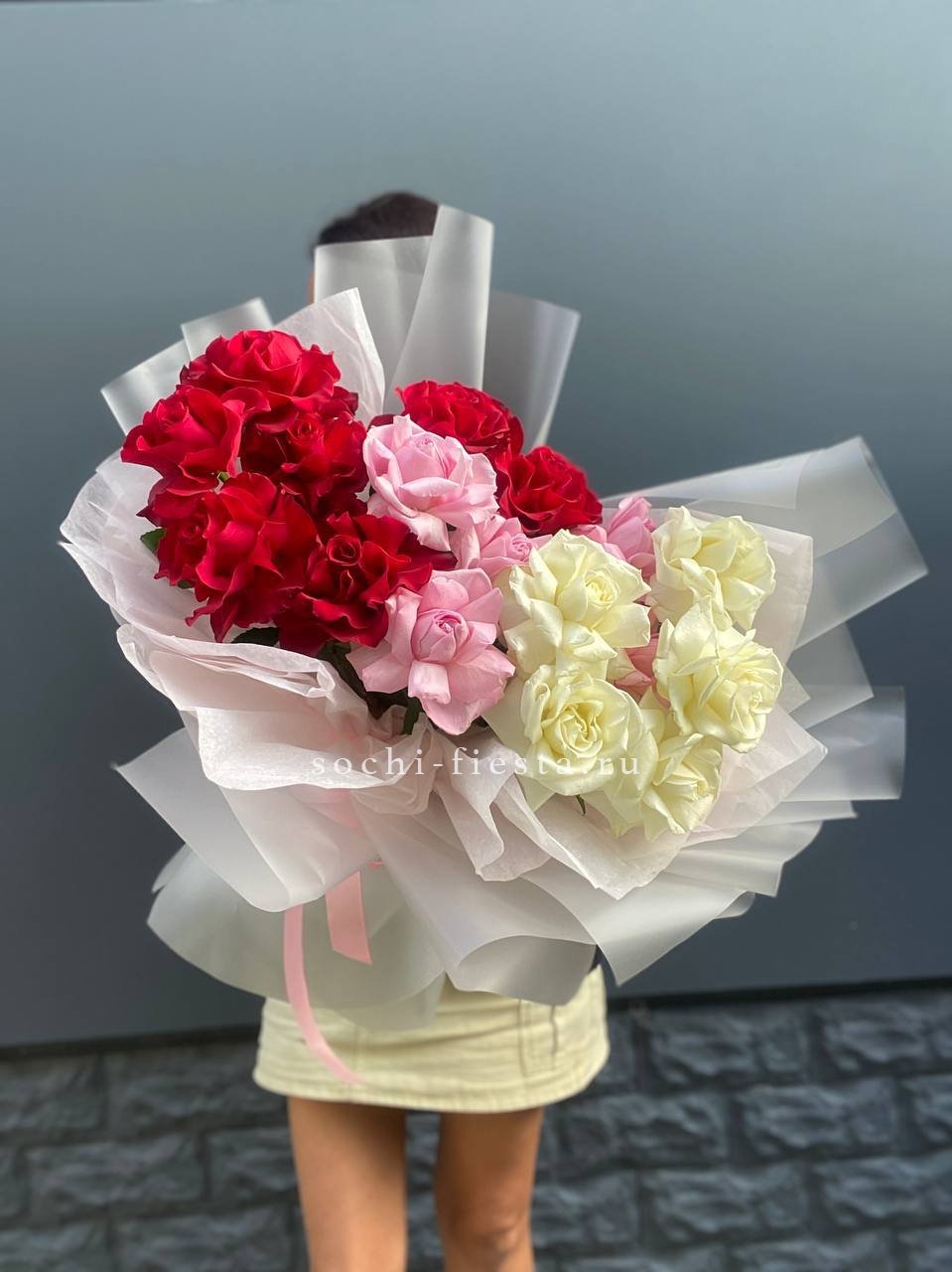 Двадцать пять разноцветных роз Carousel в прозрачной корейской пленке. Яркая палитра от персиковых до малиновых оттенков создает живописное впечатление с первого взгляда.