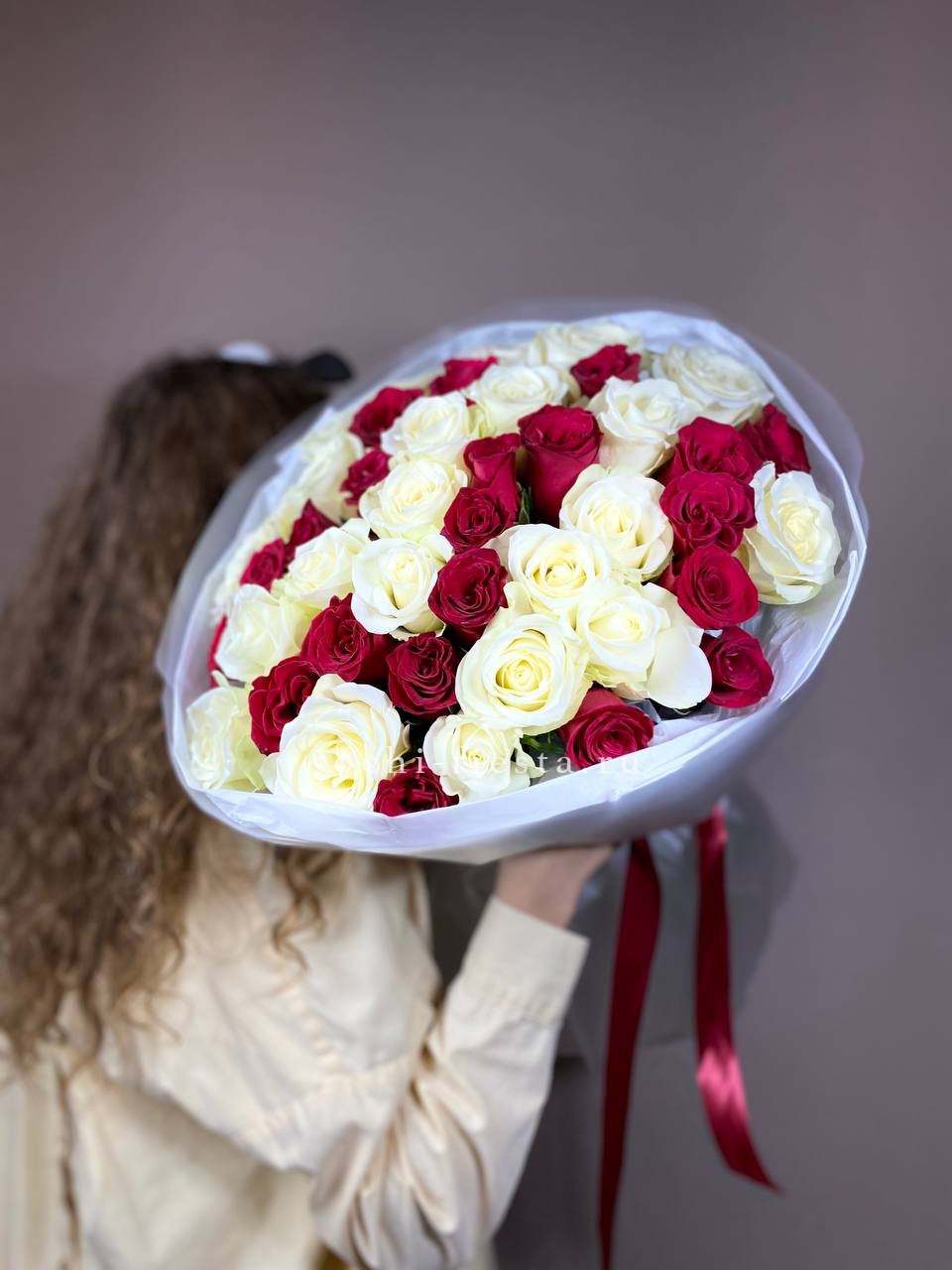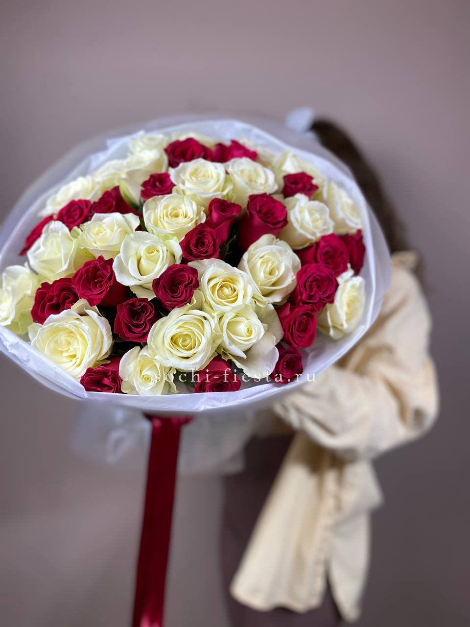 В составе 45 красно-белых роз.