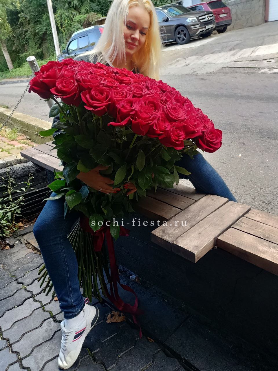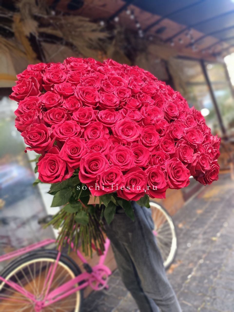 101 роза разноцветных оттенков, лента, упаковка на выбор.