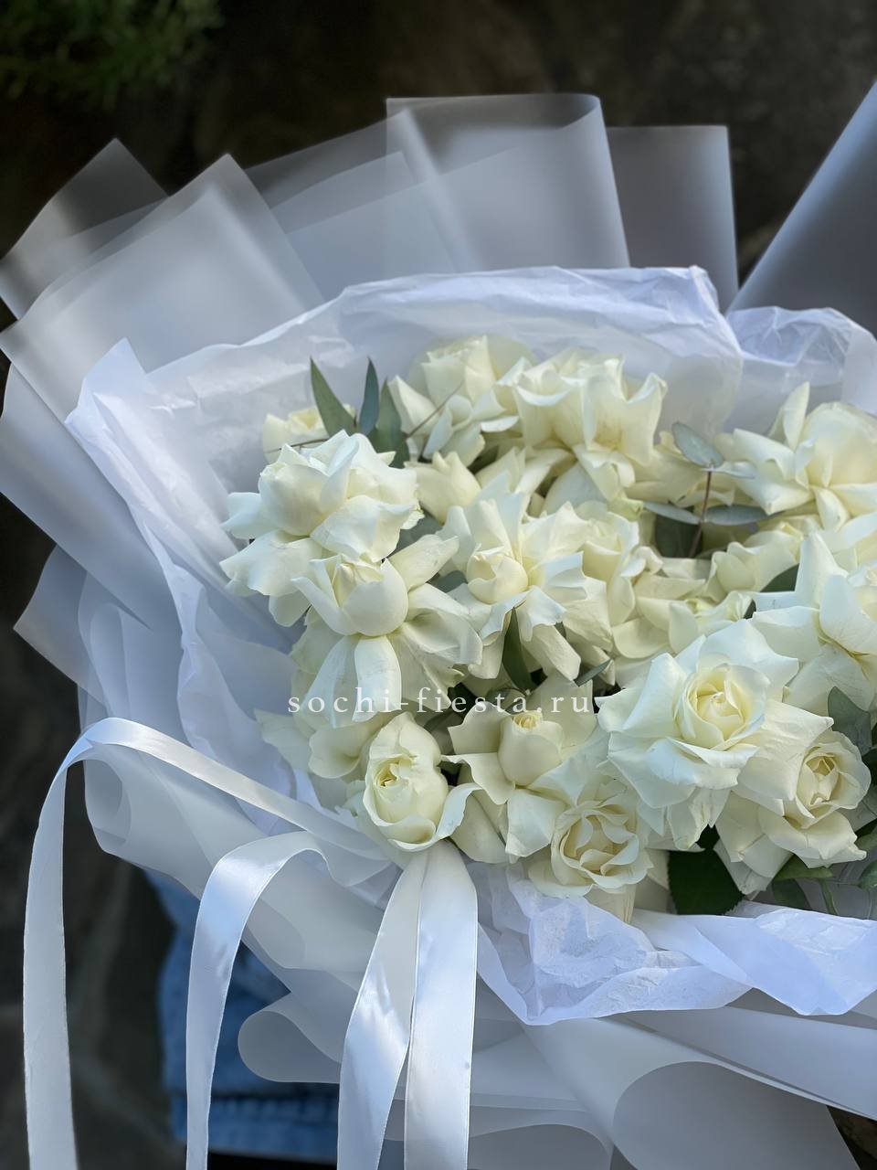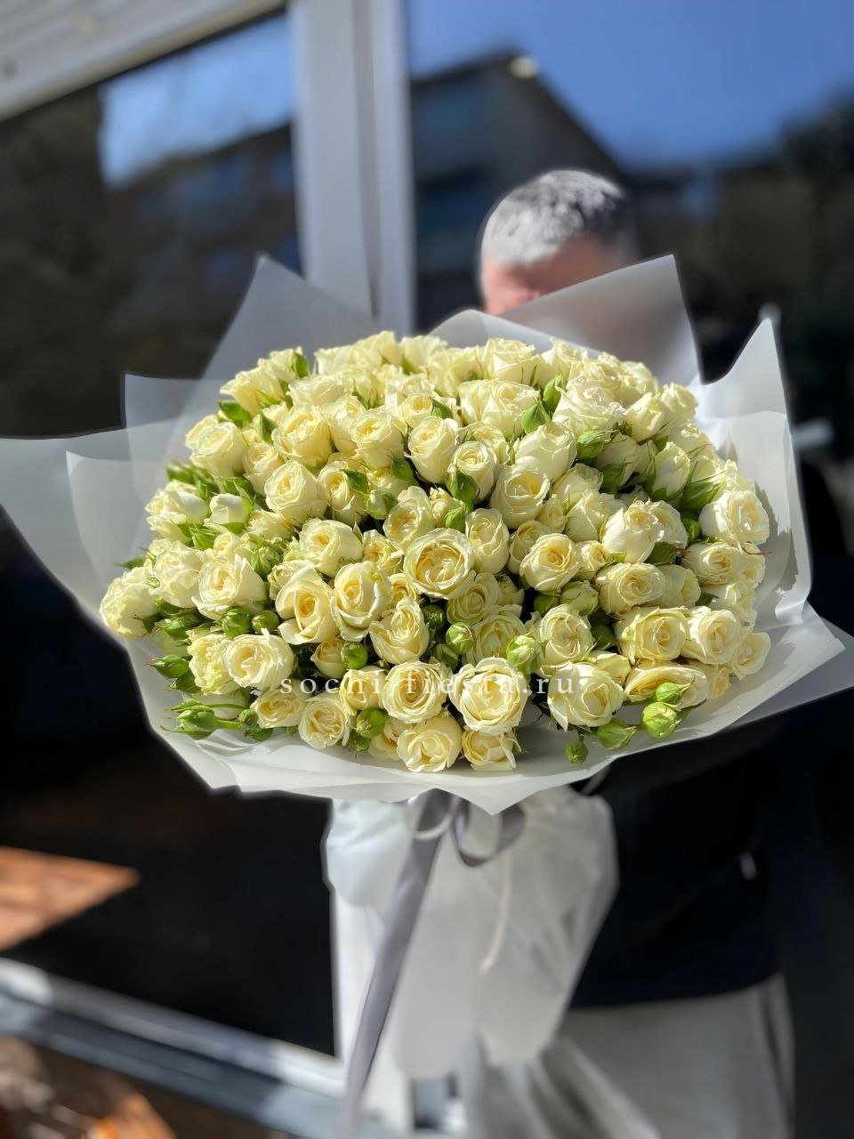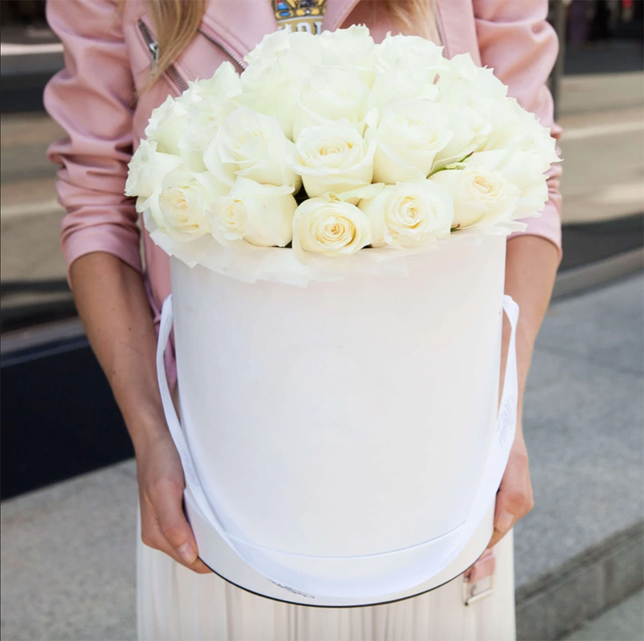 Триста три белые розы в единой композиции создают мощное визуальное присутствие. Монохромное решение и масштаб букета производят впечатление с первого взгляда.