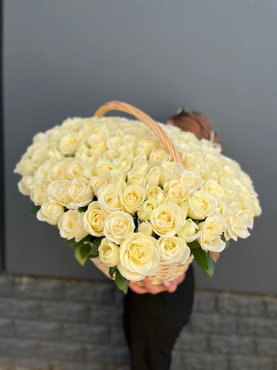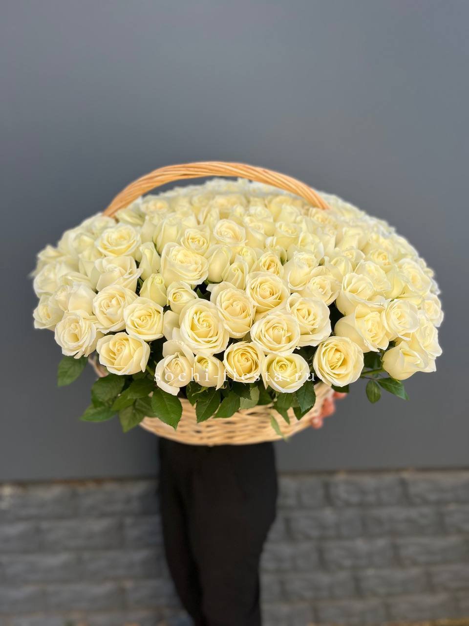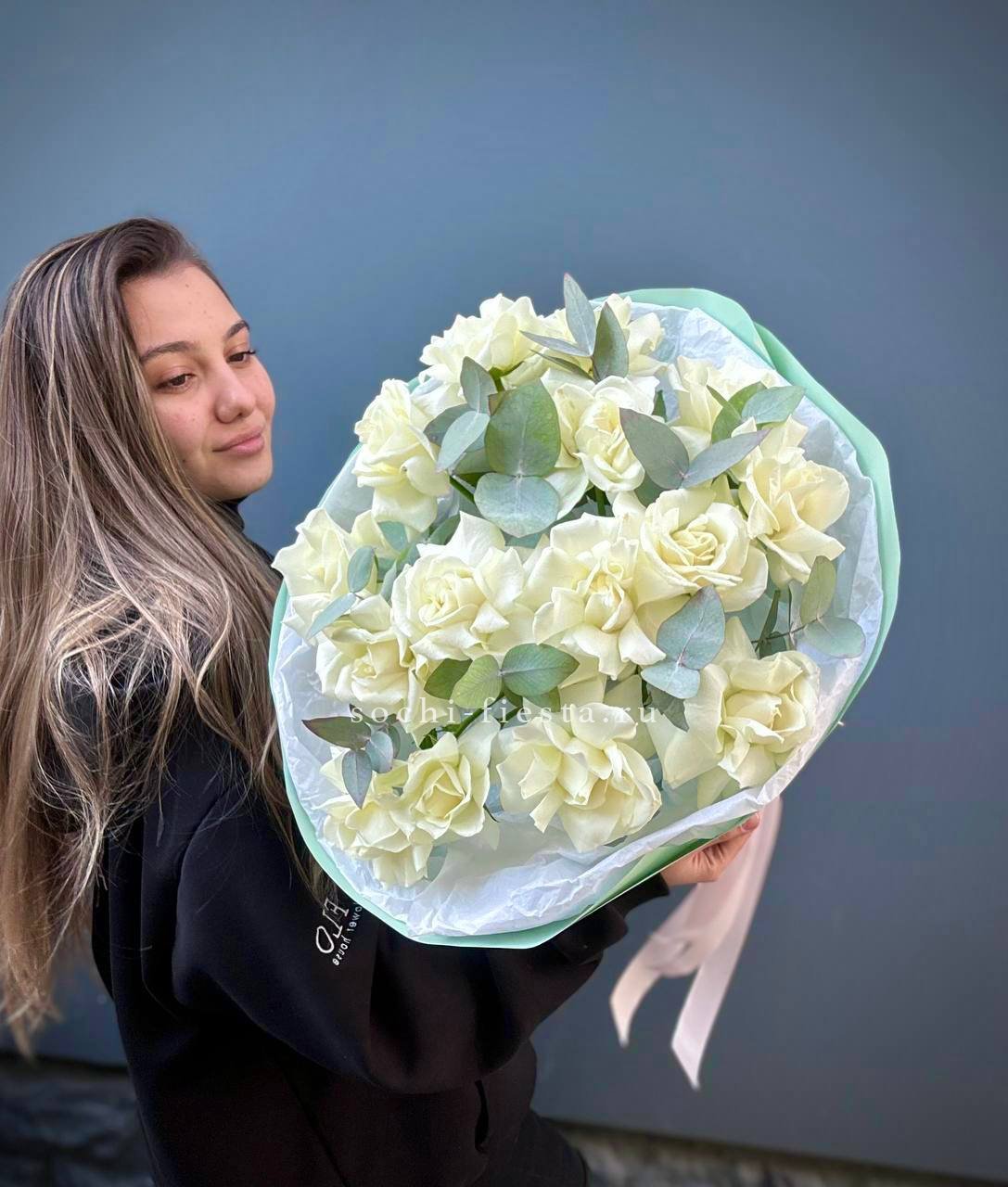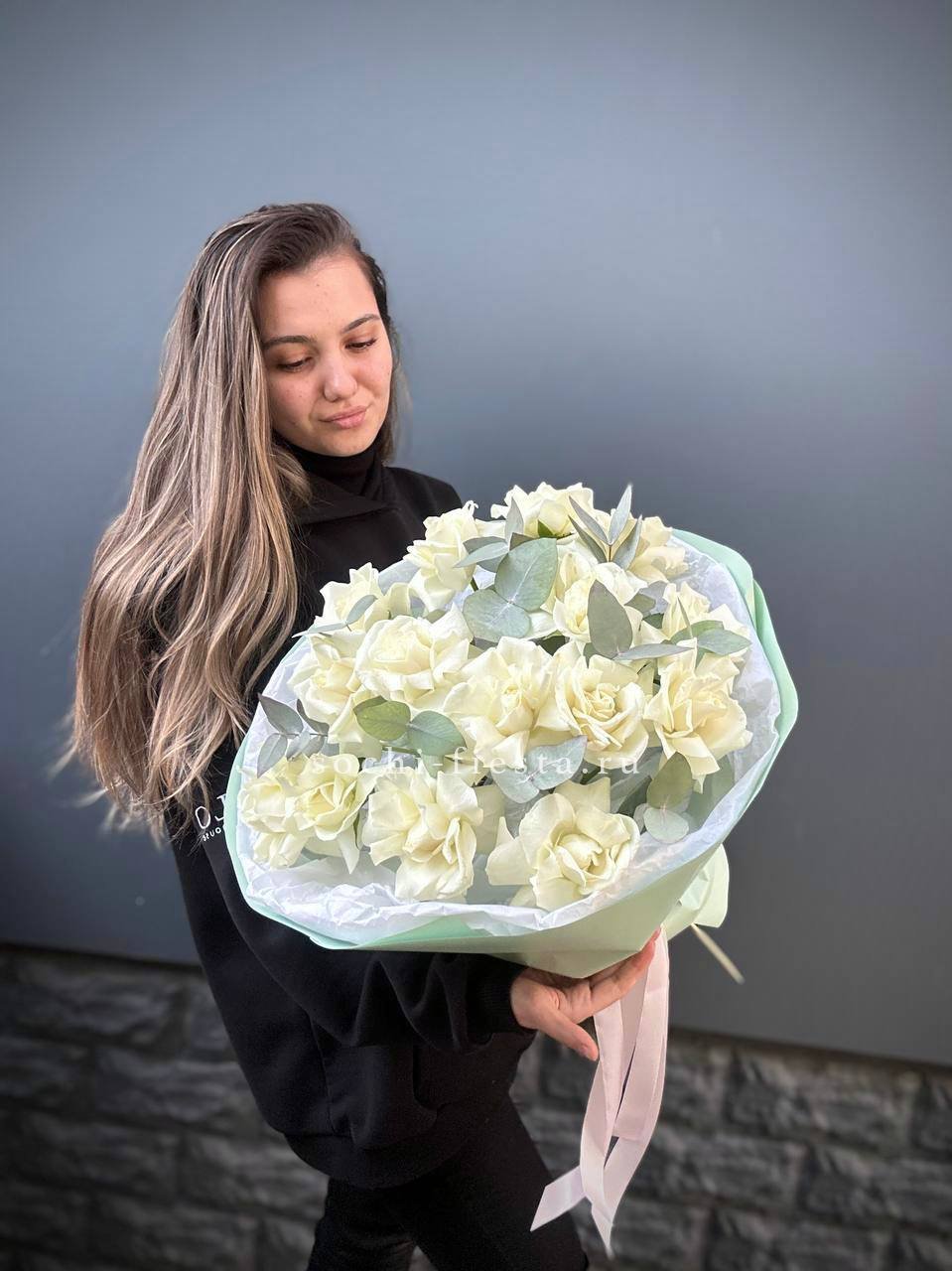 Тридцать семь белых французских роз собраны в круглый бокс с ветками эвкалипта. Плотная укладка бутонов создает объемную композицию, где каждый цветок виден и держит форму. Безупречное решение для яркого события.