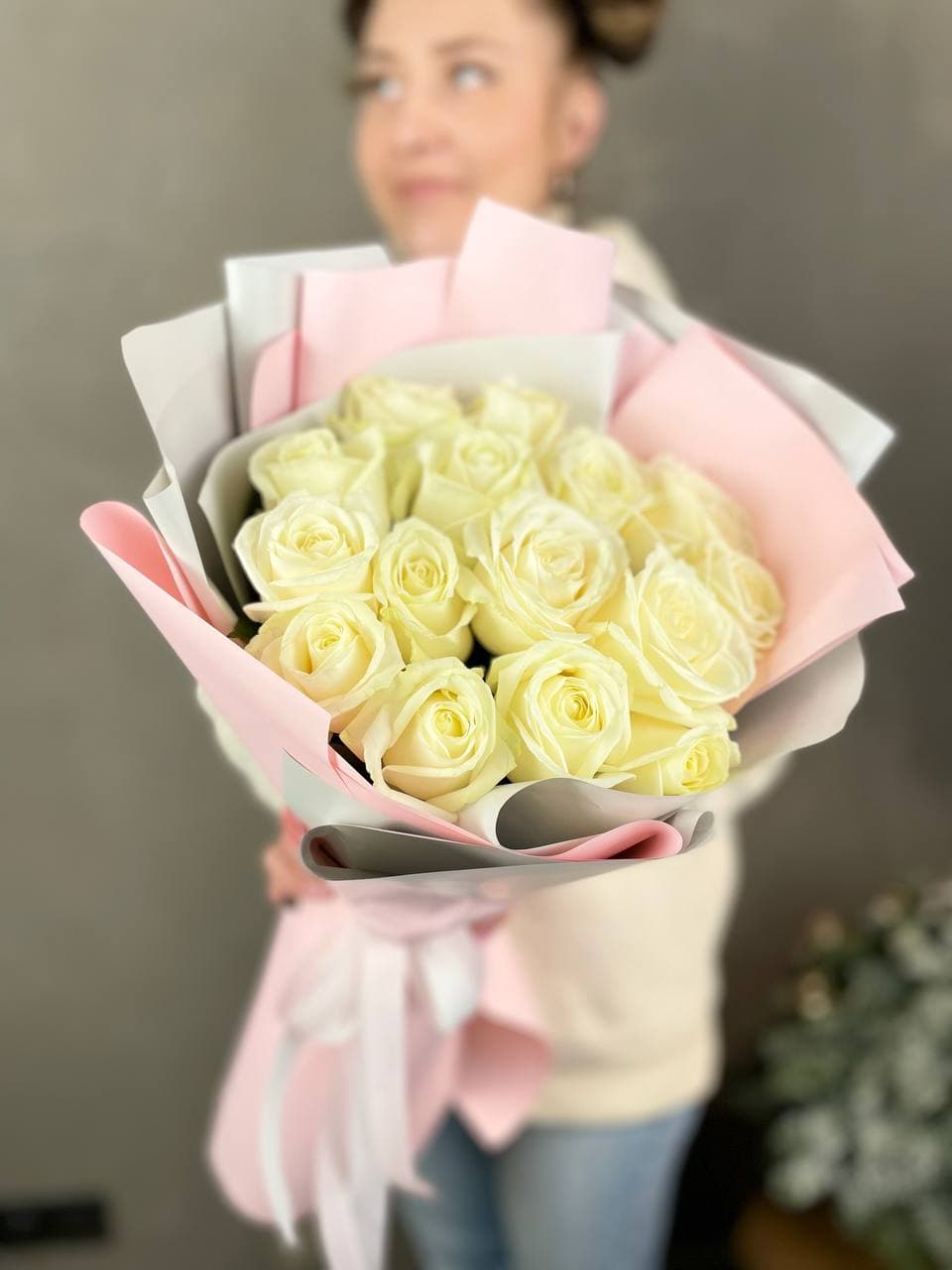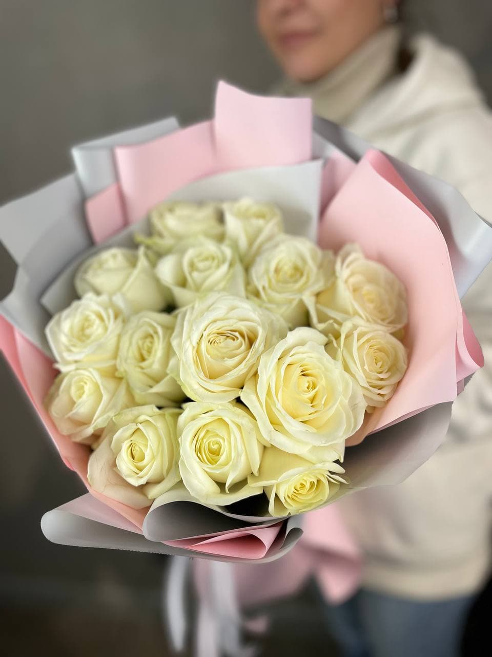 Пятнадцать белоснежных роз собраны в аккуратную форму с ровным силуэтом. Композиция сохраняет свежесть и держит структуру благодаря продуманному размещению бутонов в цилиндре.
