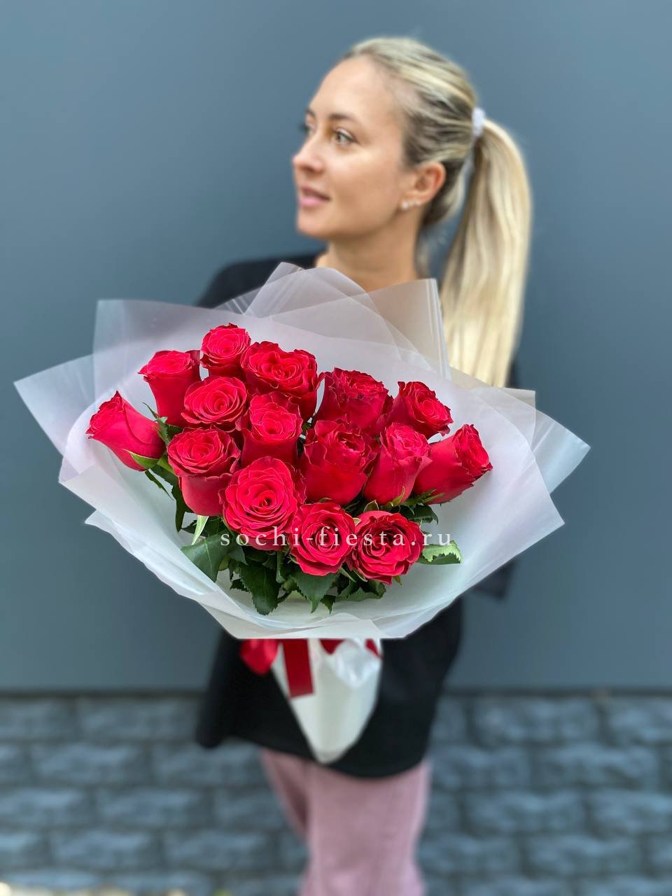 Двадцать три бутона выстроены в плотную округлую форму с чёткими линиями и выразительным силуэтом. Французские розы держат форму уверенно, а свежая зелень добавляет композиции графичности и завершённости.