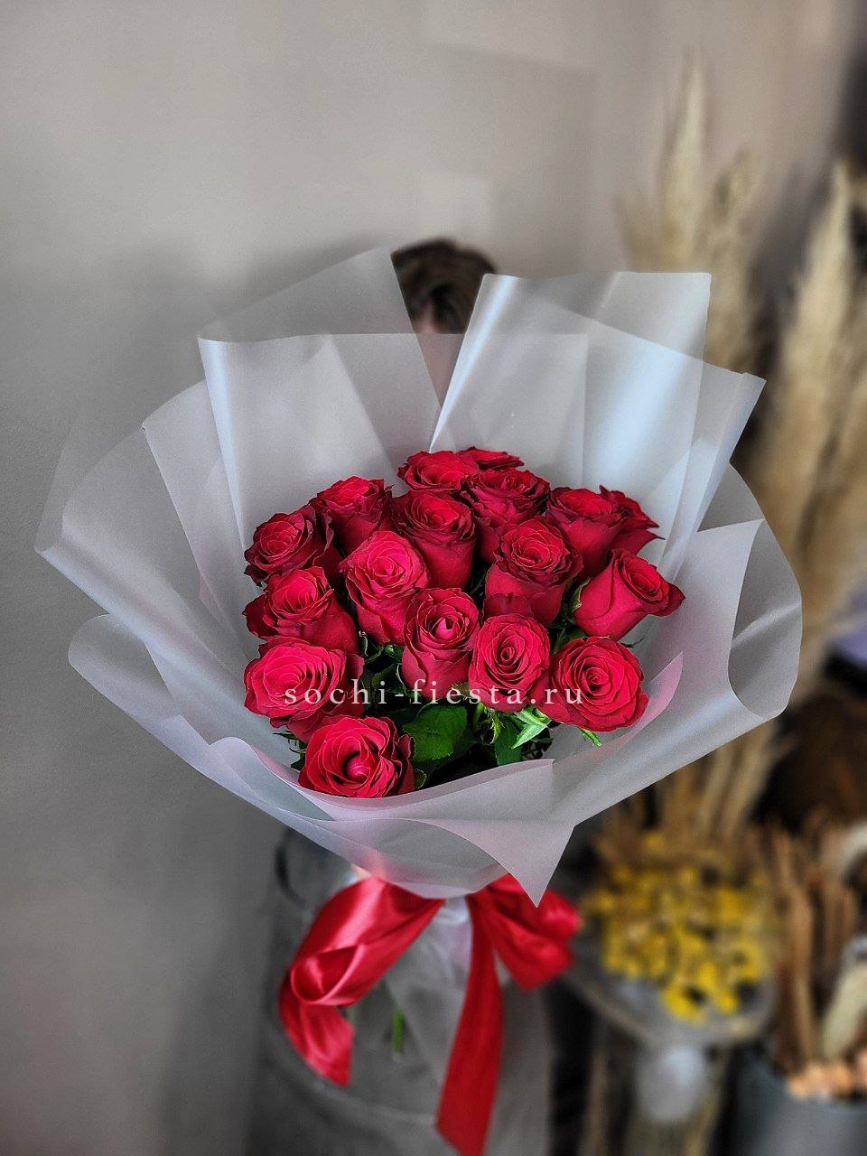 Алые розы с бархатистыми лепестками в авторской упаковке. Вы выбираете количество стеблей и получаете букет, который говорит без слов о силе чувств.