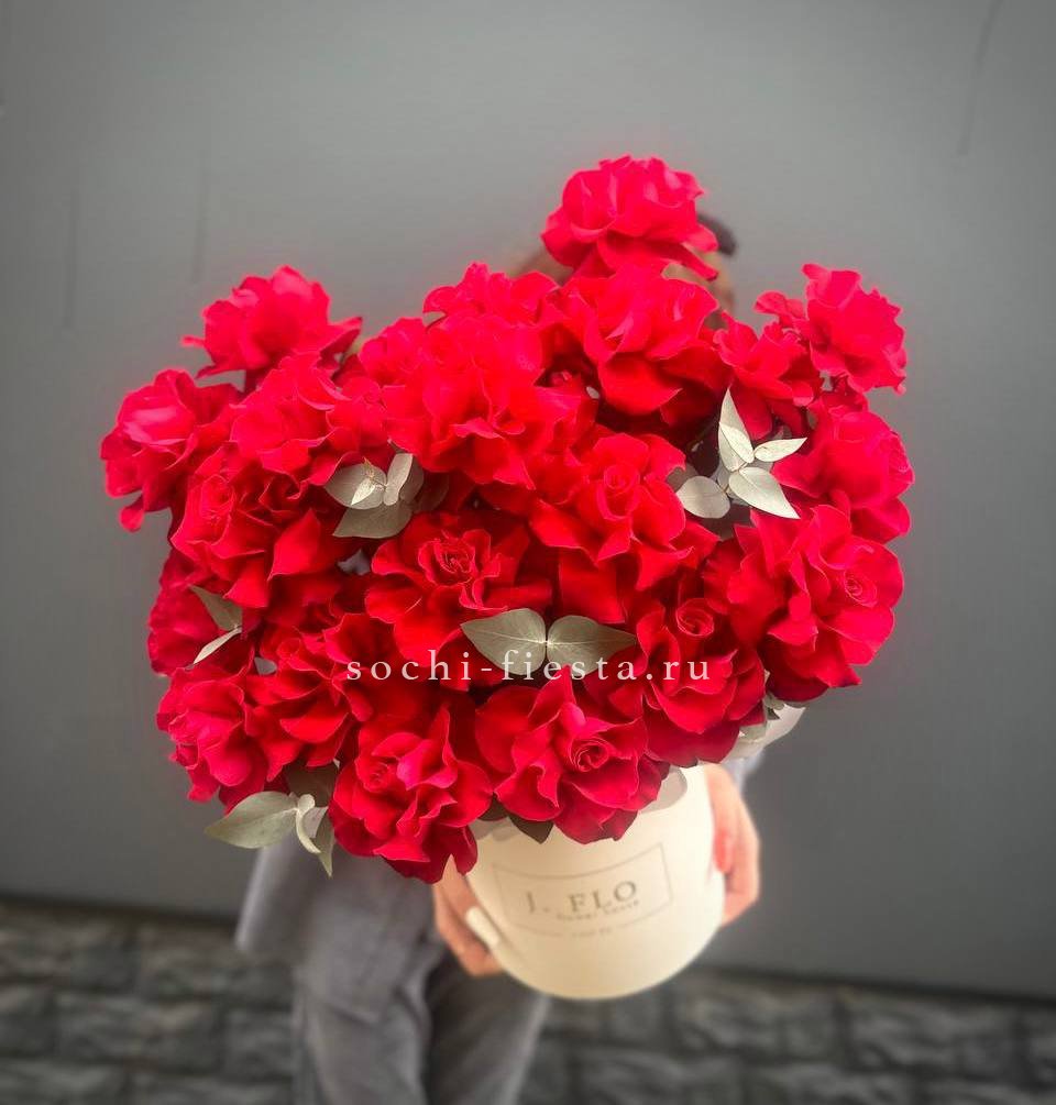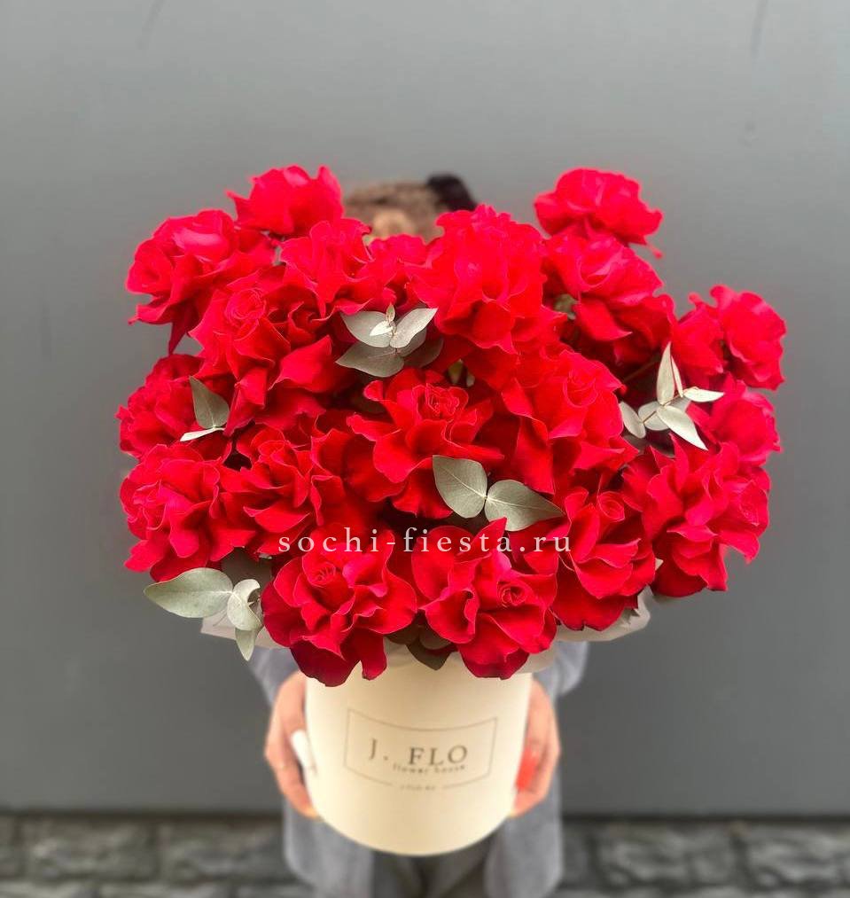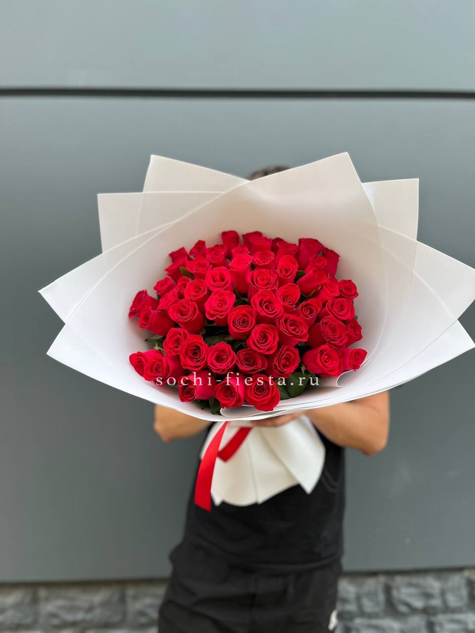 Красные розы собраны плотно и графично. Линии букета выстроены чётко, каждый бутон держит форму и создаёт общий ритм композиции.