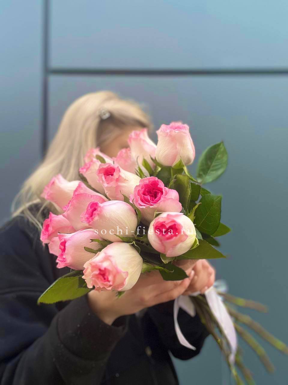 роза розовая - 101 шт., лента, белая дизайнерская бумага.