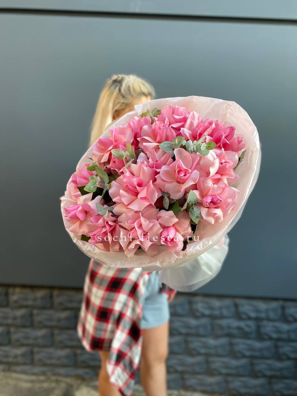 Семнадцать бутонов создают пышный объём и уверенное присутствие в любом пространстве. Розовый тон дополнен матовой зеленью эвкалипта. Букет держит форму и остаётся свежим долгое время.