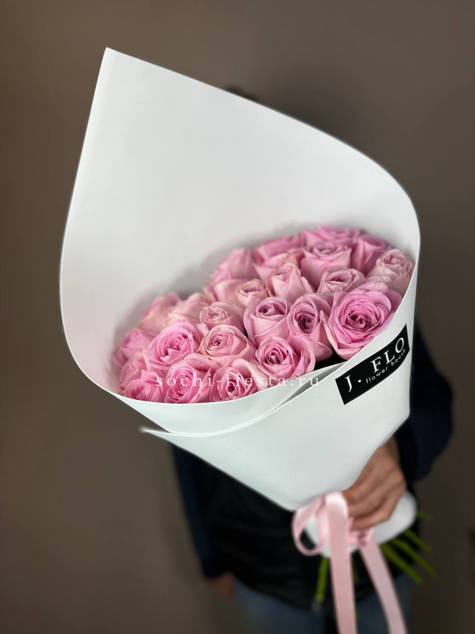 Двадцать пять роз нежно-розового оттенка собраны в аккуратный букет с продуманной упаковкой. Бутоны держат форму долго и радуют свежестью.