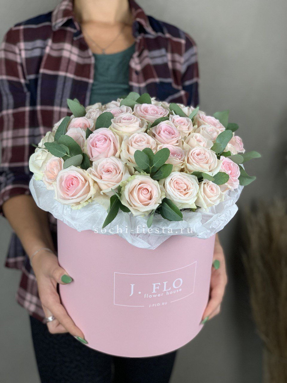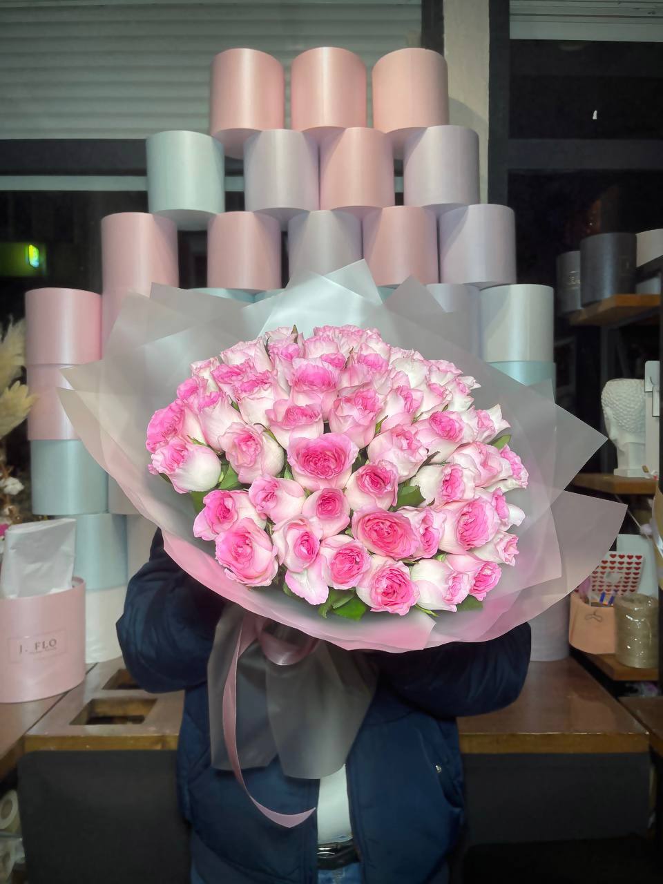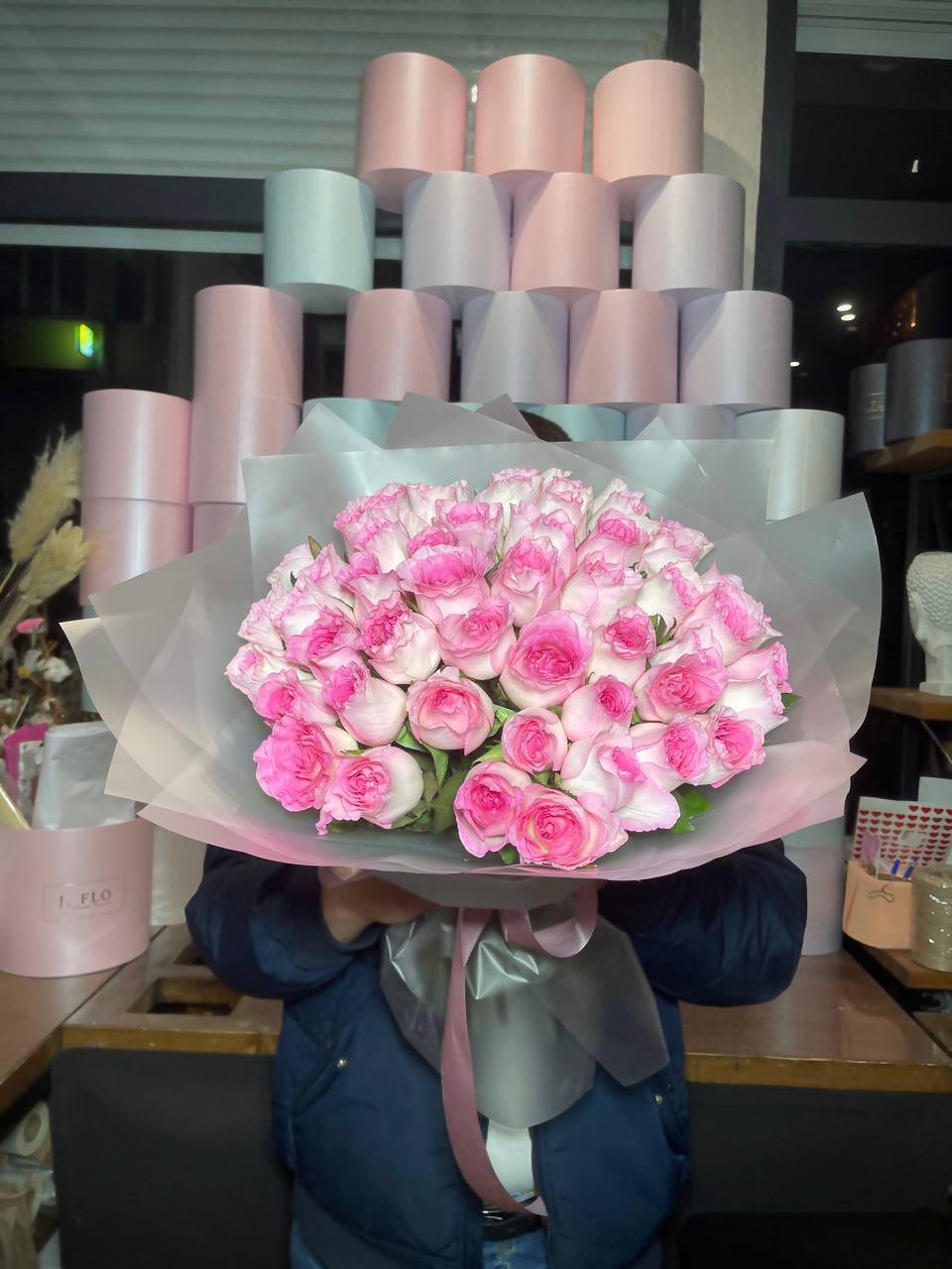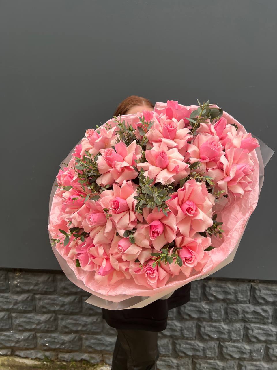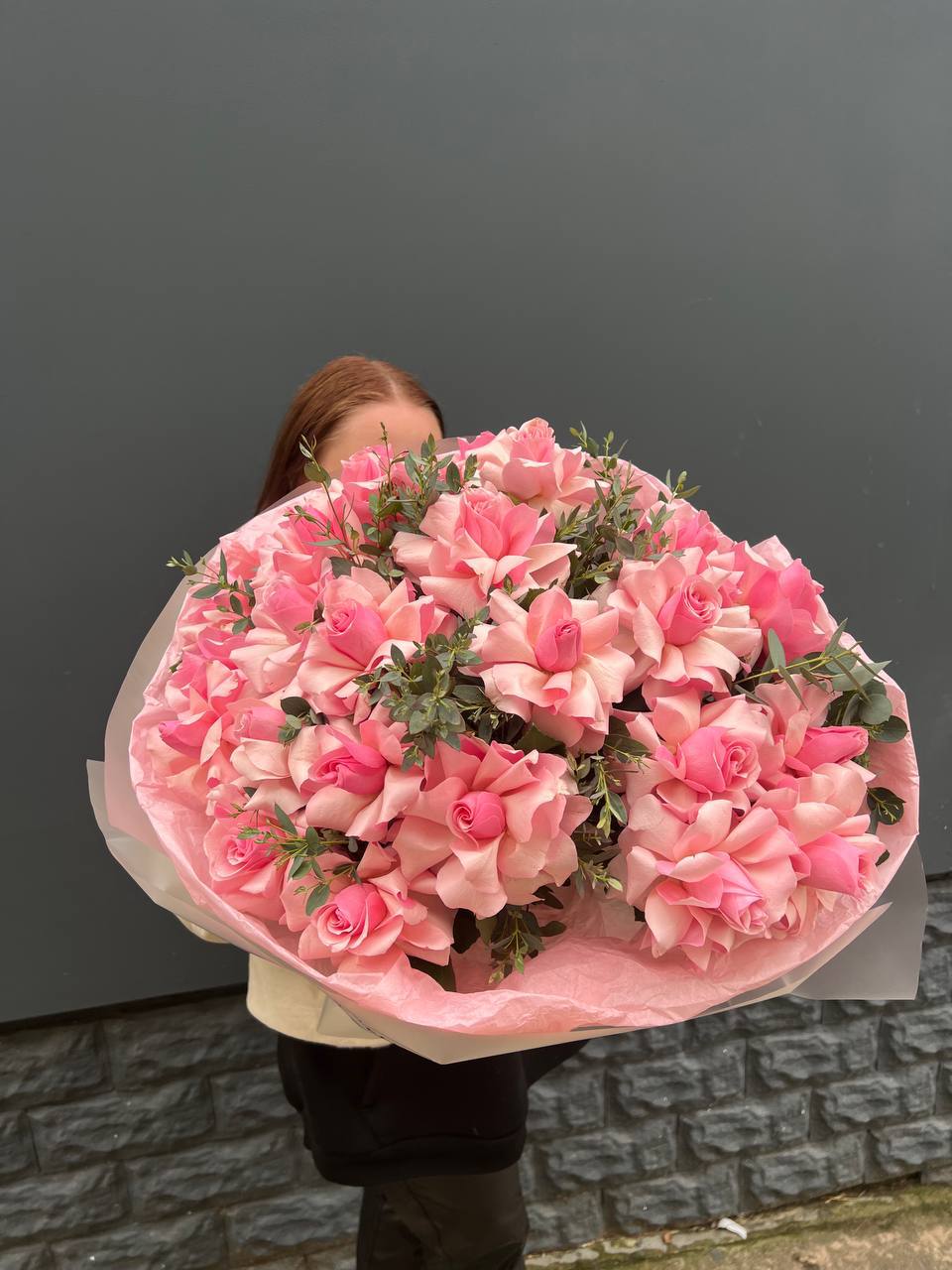 Пятьдесят одна роза собрана в плотный монохромный букет, где каждый бутон создаёт общий объём и глубину. Розовый оттенок раскрывается по-разному в зависимости от света и угла обзора. Композиция впечатляет масштабом и цельностью формы.