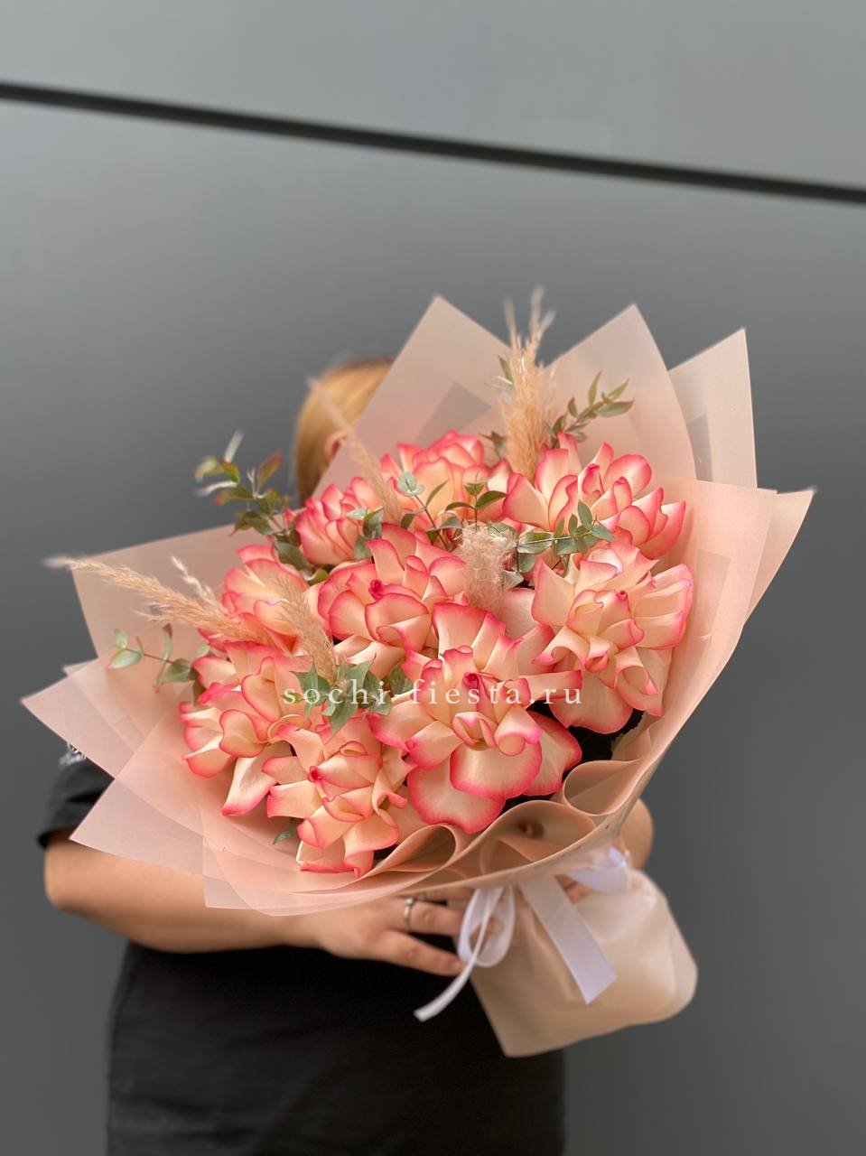 Вывернутые бутоны французских роз раскрывают слои лепестков с текстурной глубиной. Эвкалипт добавляет воздушности, а авторская упаковка завершает композицию.