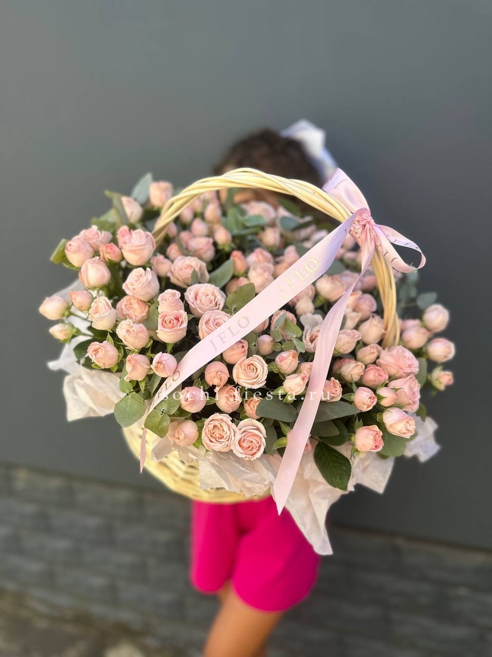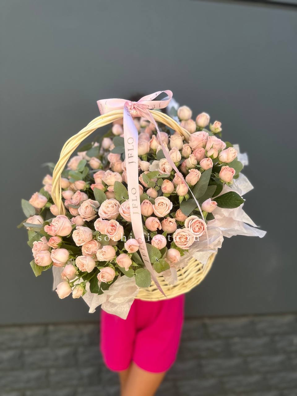 Сто один бутон Бомбастик укладывается плотными кругами в просторную корзину. Эвкалипт обрамляет композицию свежей зеленью, а пышные головки роз формируют мягкую волнистую поверхность.