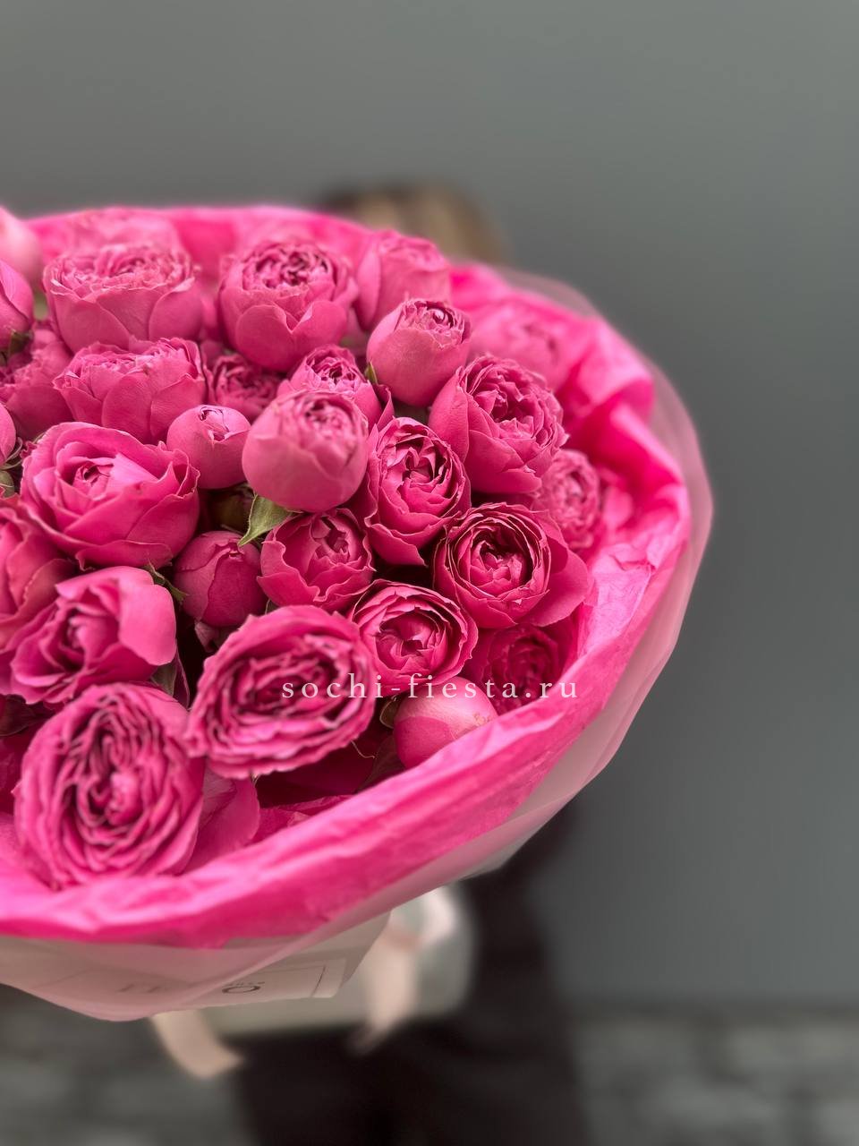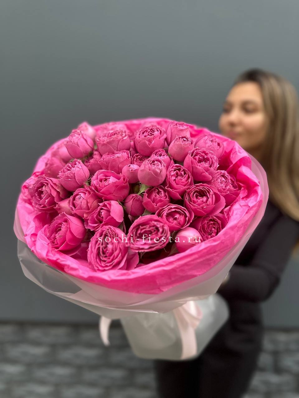11 пионовидных кустовых роз розового оттенка, оформление.