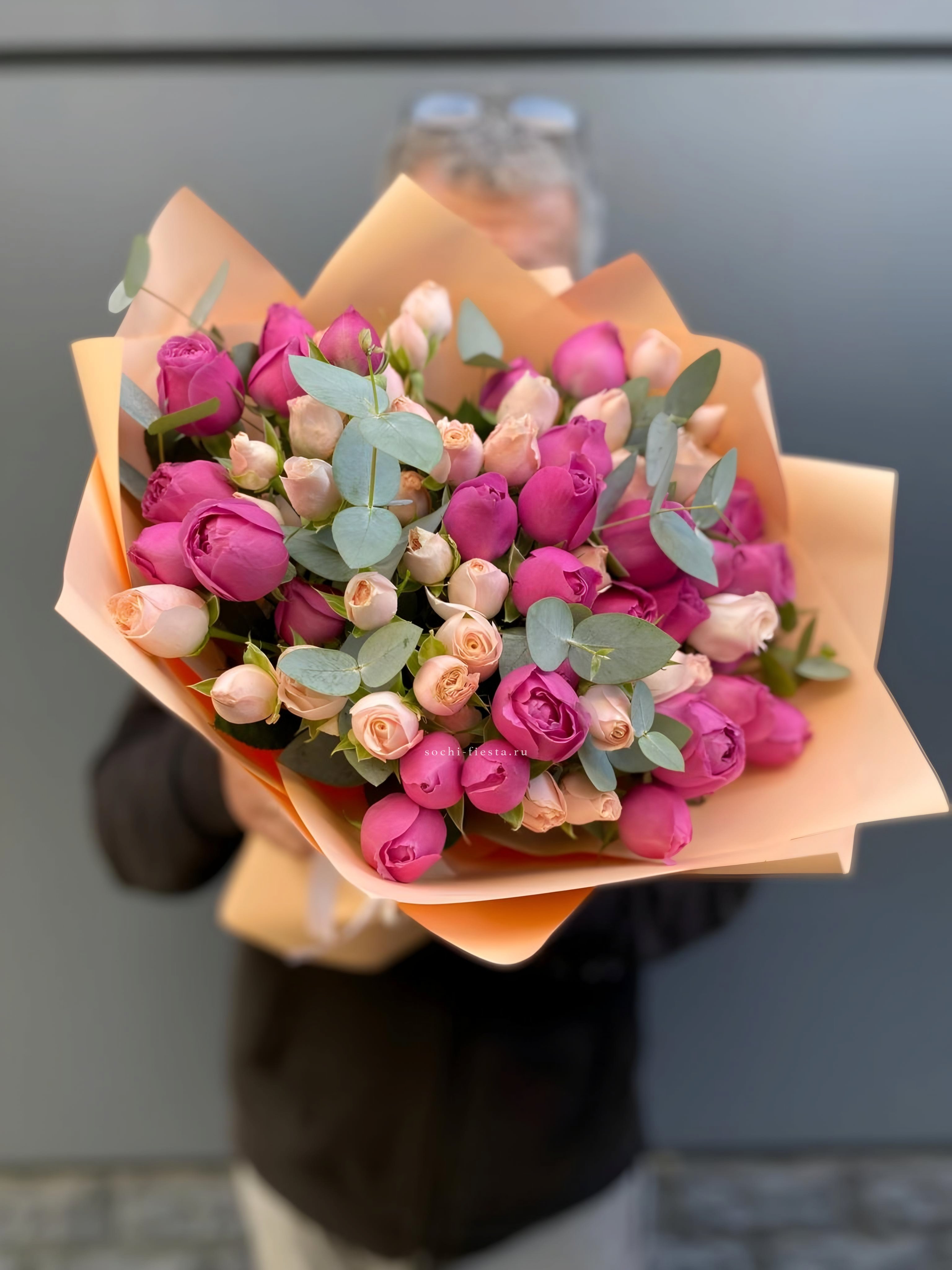 Пятнадцать роз Мисти Бабблс с пышными многослойными бутонами создают объёмную композицию с живой текстурой. Лепестки раскрываются волнами, образуя плотную шапку с мягкими переходами оттенков. Веточка эвкалипта добавляет свежести и завершает образ.