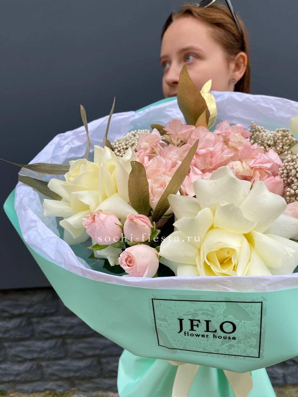 Белые розы и шары гортензии заполняют пространство плотно, но без тяжести. Озатамус вносит лёгкую текстуру, а эвкалипт завершает силуэт спокойной зеленью.