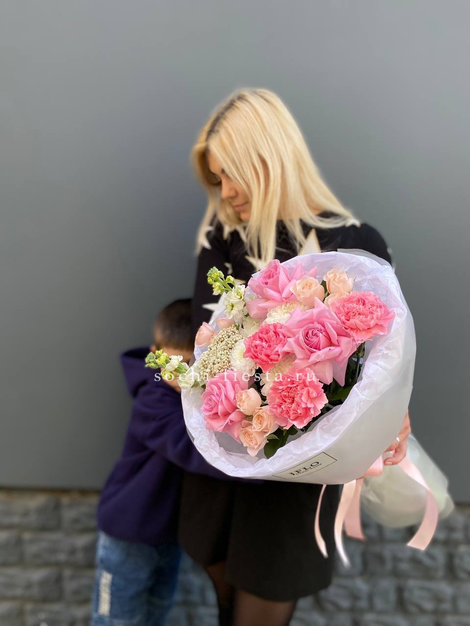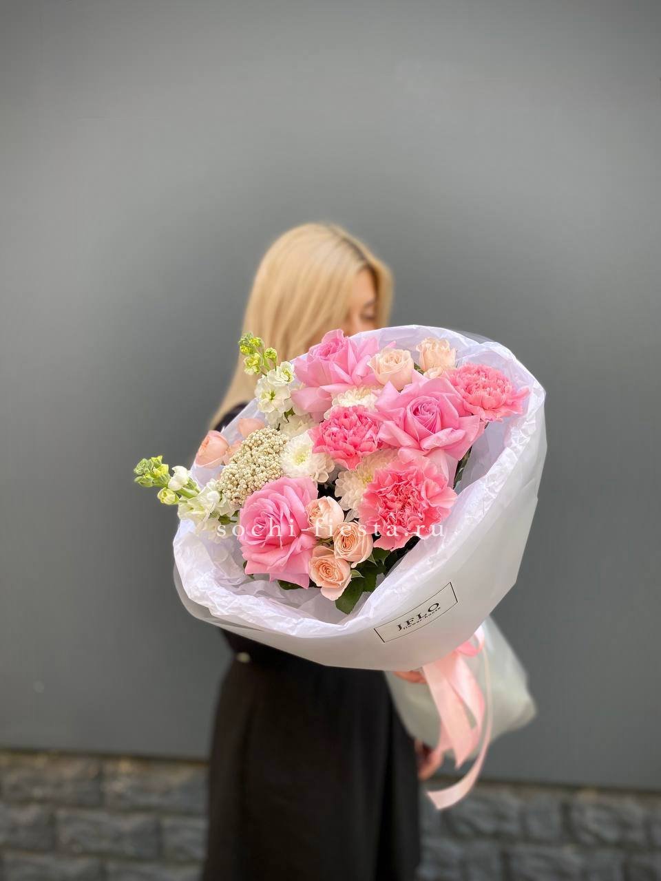Пастельная гамма с лёгким касанием зимнего воздуха. Кустовые розы и диантус окружены воздушным ковылём, создавая мягкую текстуру с едва уловимой графикой. Гортензия добавляет объём, не перегружая силуэт.