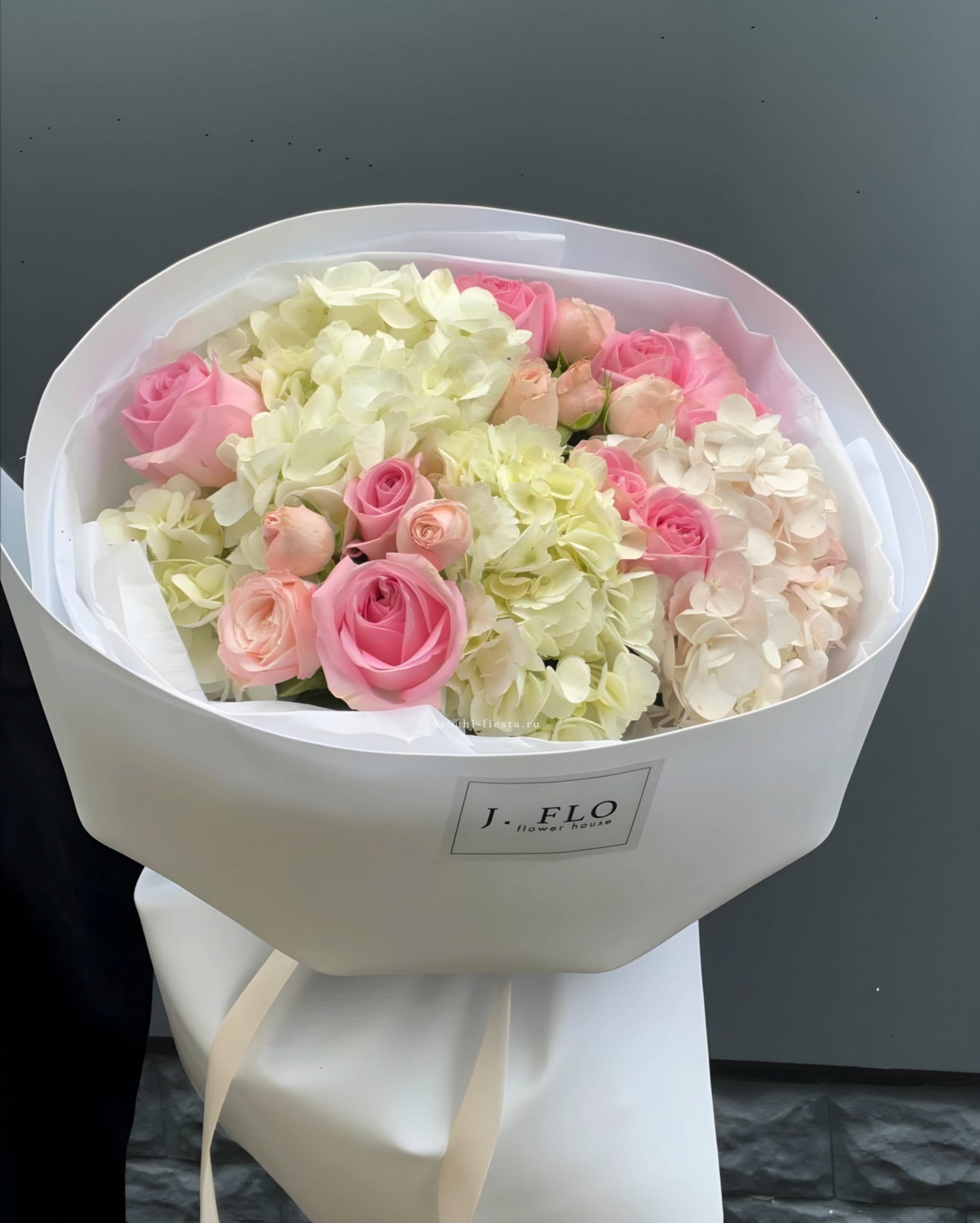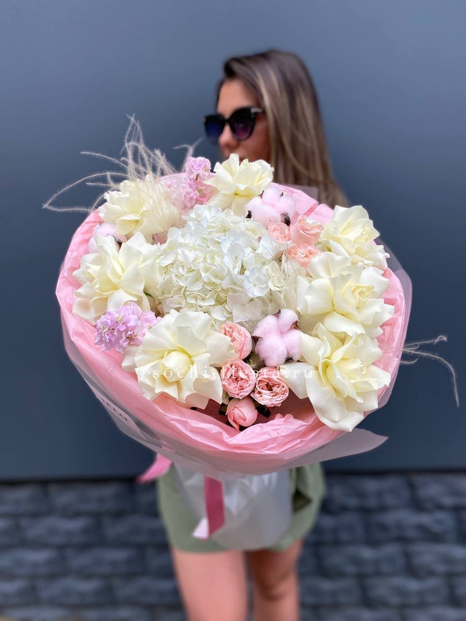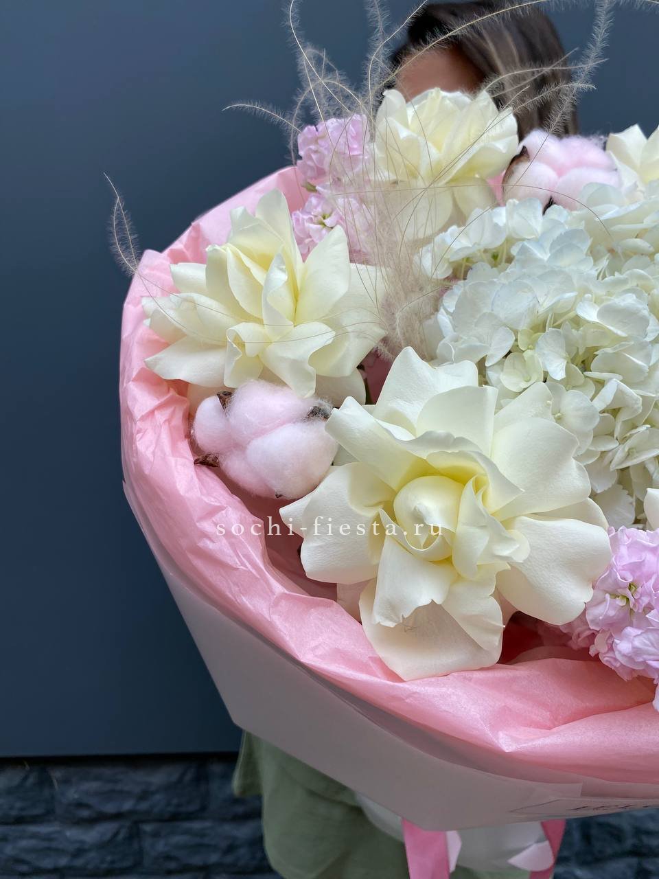 Белые французские розы переплетаются с пушистыми соцветиями маттиолы и хлопка. Гортензия и пионовидные бутоны создают объём, а ковыль вносит лёгкую небрежность в общий ритм.