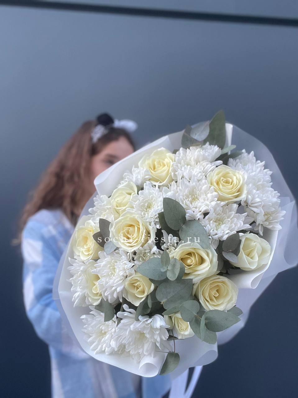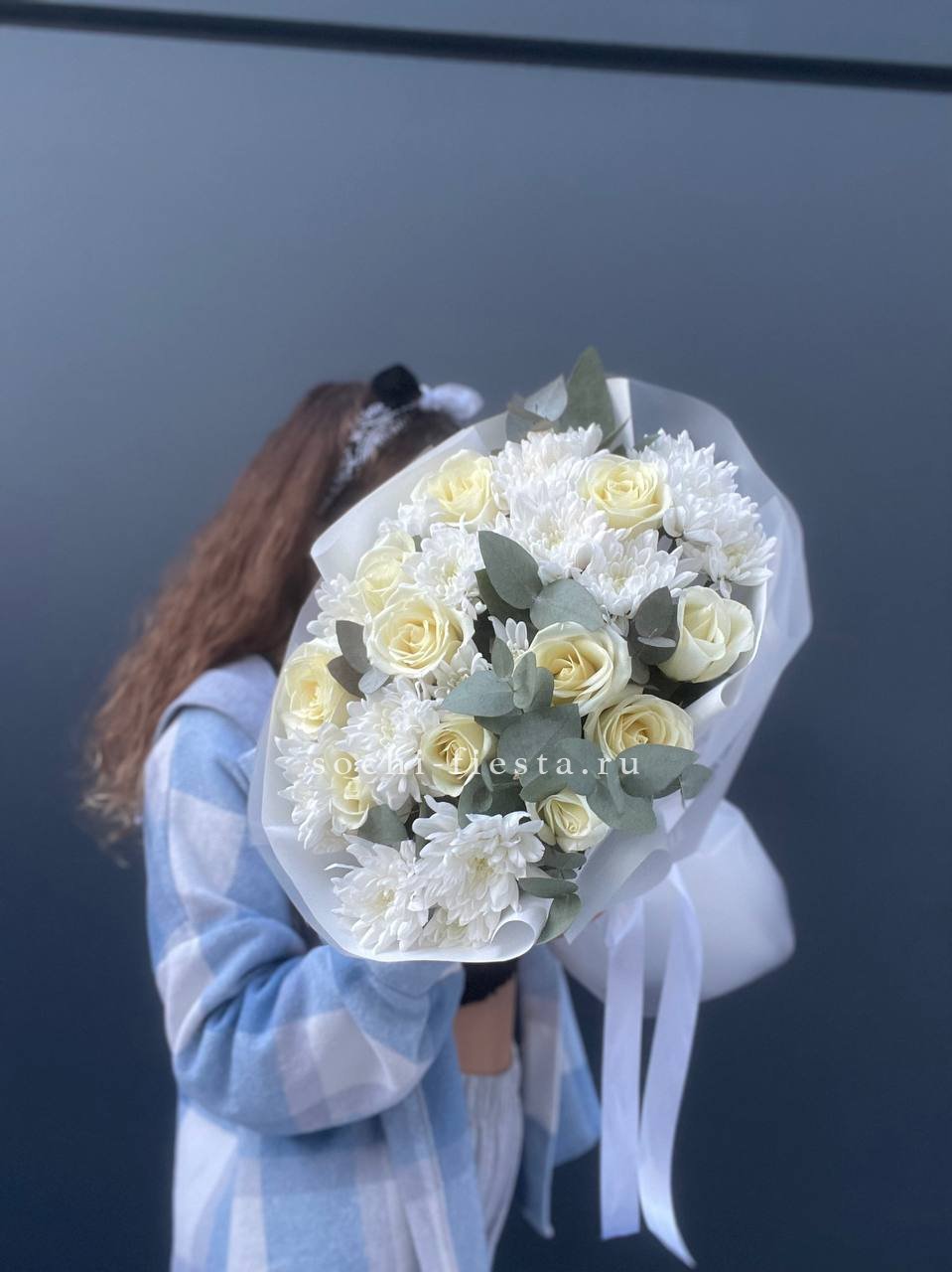 Белые розы и гортензия дополнены диантусом в воздушной дизайнерской пленке. Светлая гамма и аккуратная форма позволяют букету легко вписаться в любое пространство.