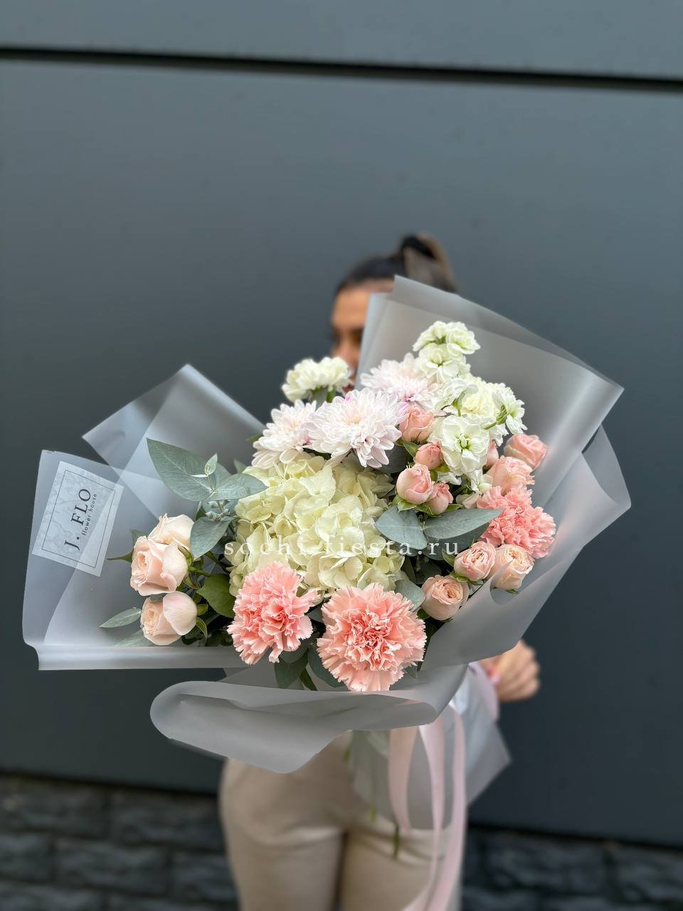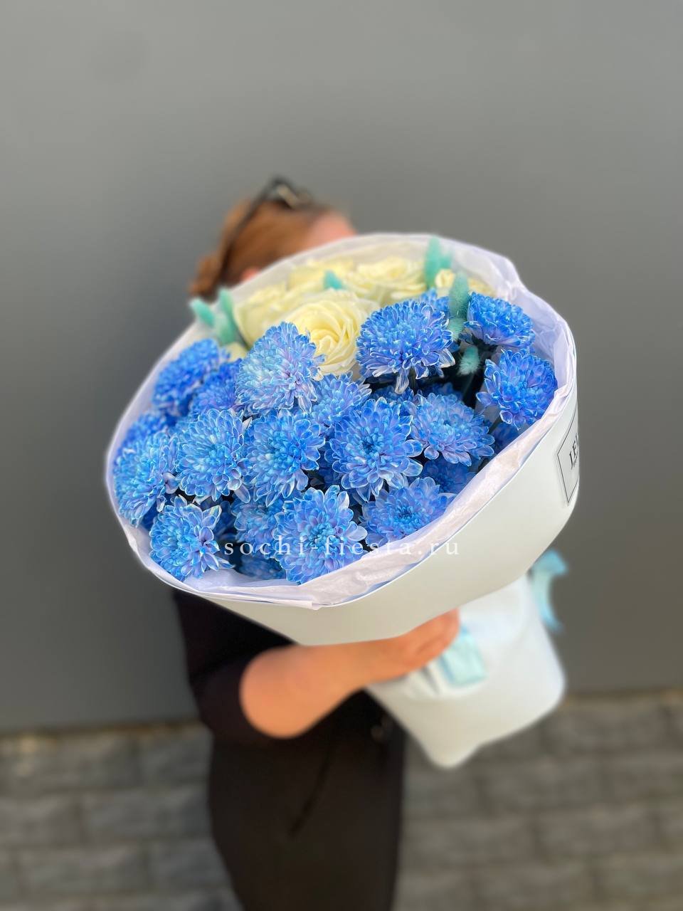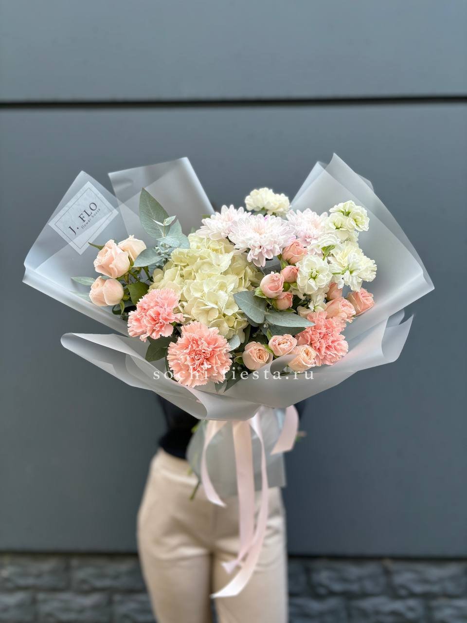 гортензия, хризантема, хамелациум, гербера, мисти баблс, диантус, пленка.