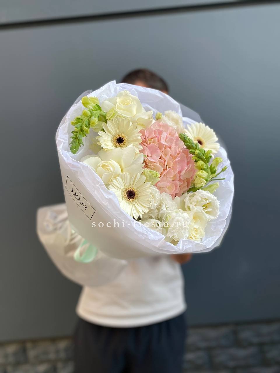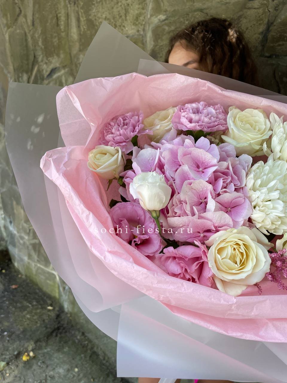 гортензия, диантус, хризантема, бомбастик, озатамус, пленка.