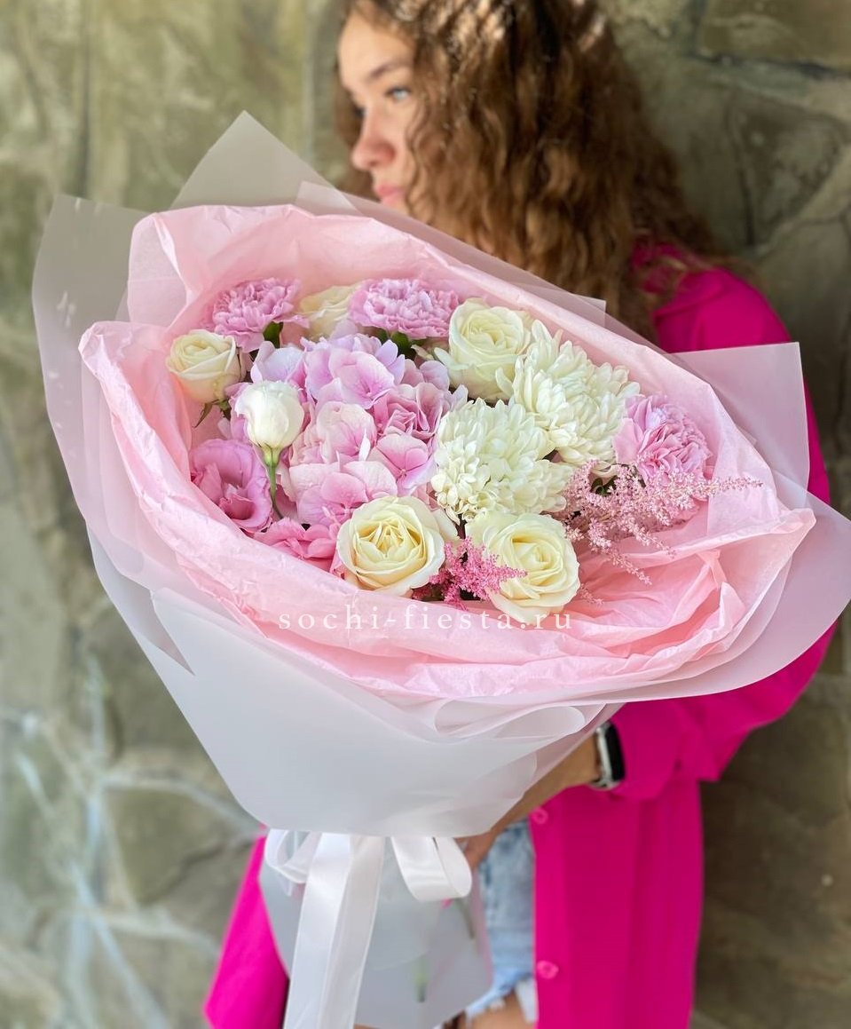 Яркая композиция объединяет пышную гортензию, игривые соцветия диантуса и солнечные хризантемы. Бомбастик добавляет объёма, а озотамнус создаёт лёгкую воздушность между крупными бутонами. Букет радует глаз насыщенными красками и жизнерадостным характером.