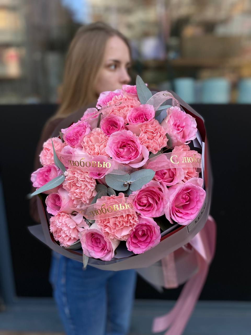 Кустовые розы и эустомы собраны в компактную форму с мягкими линиями. Сочетание нескольких оттенков создаёт живописный эффект без лишней пышности.
