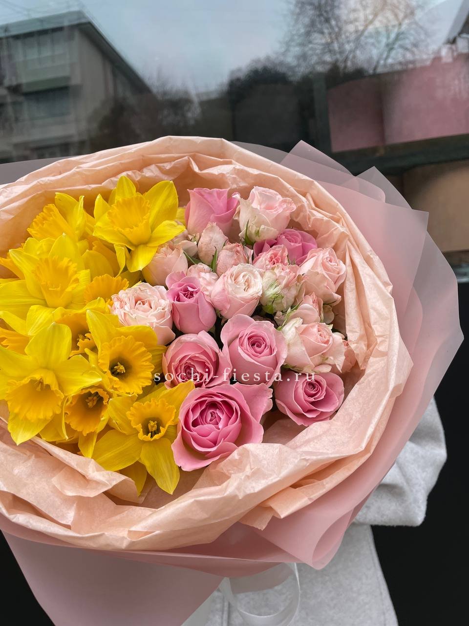 Весенние нарциссы встречаются с бархатными розами в одном букете. Пионовидные бутоны добавляют округлости, а белые и жёлтые оттенки перетекают друг в друга, создавая лёгкое цветовое движение.