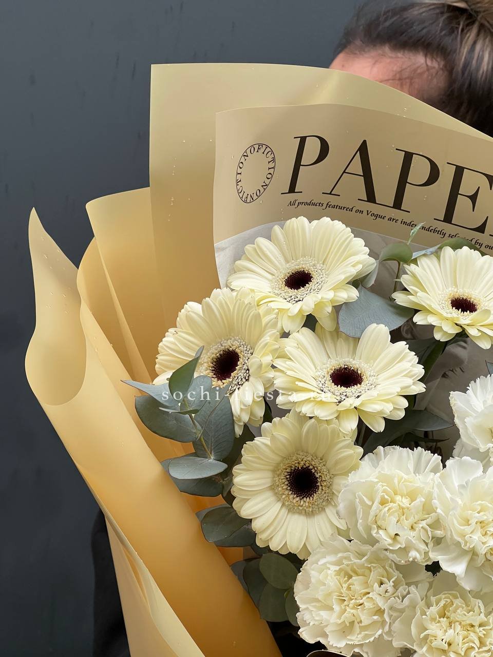 Яркие герберы и пышные диантусы создают лёгкую композицию с открытым силуэтом. Цветы словно парят в воздухе, а воздушная упаковка завершает образ без лишних деталей.