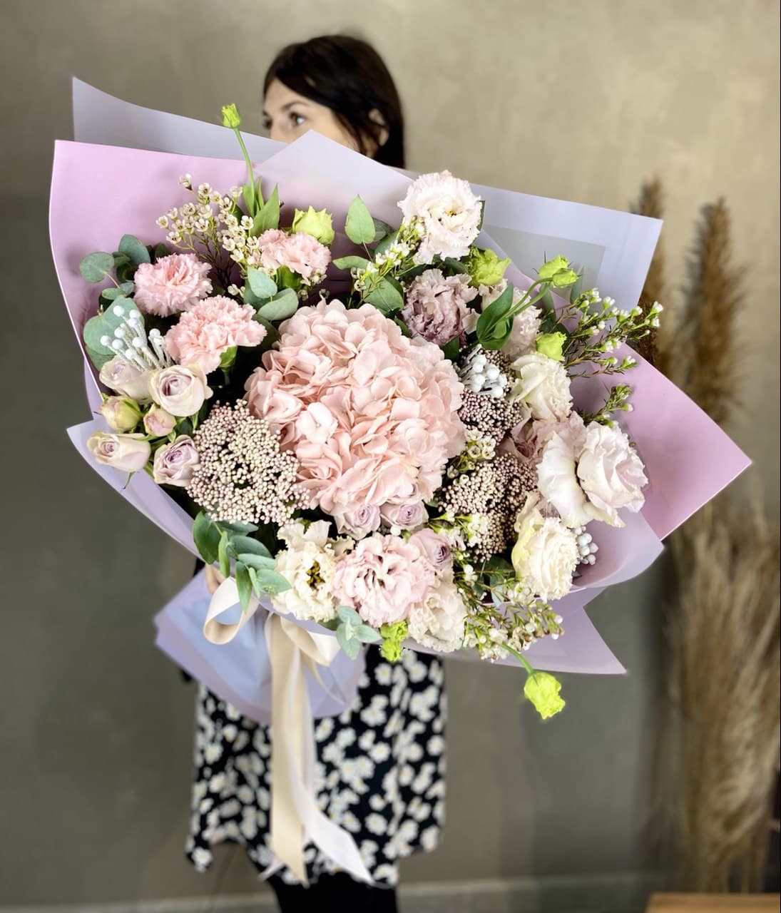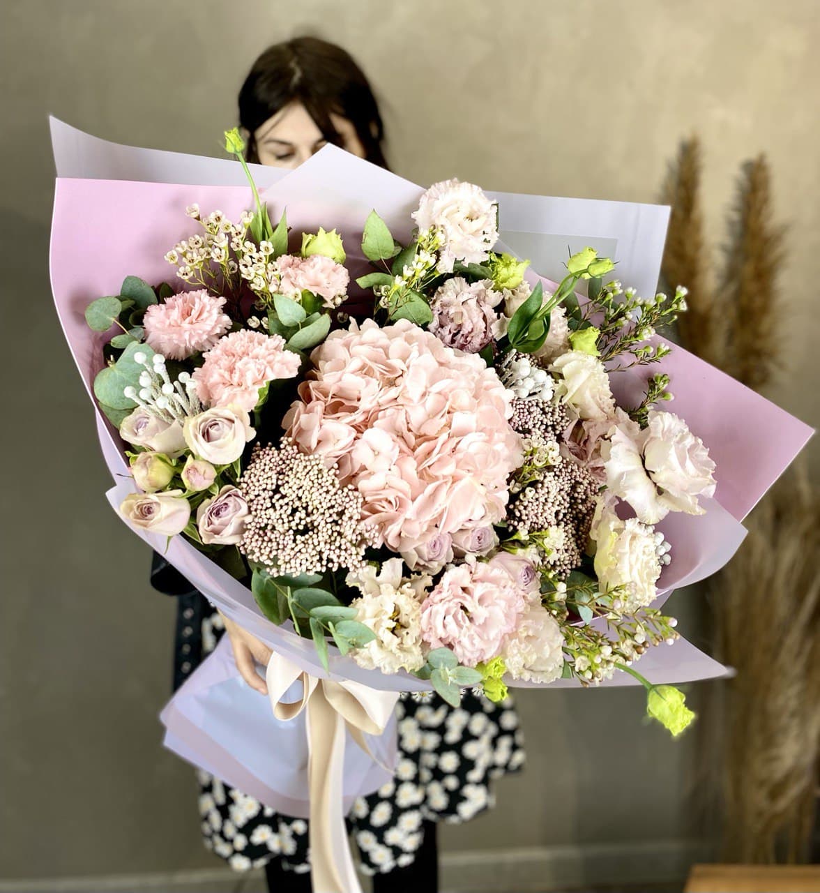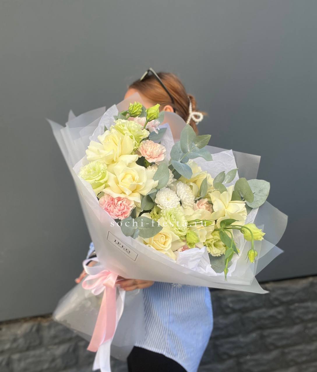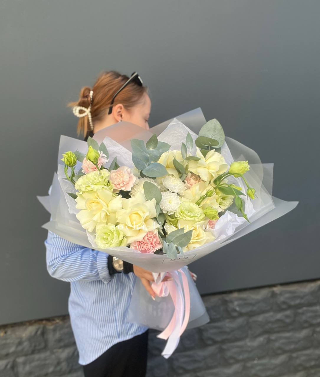 Lucrecia собрана из пионовидных и классических роз с добавлением пушистых кустовых хризантем. Букет легко впишется в современный интерьер и поддержит спокойную эстетику пространства.