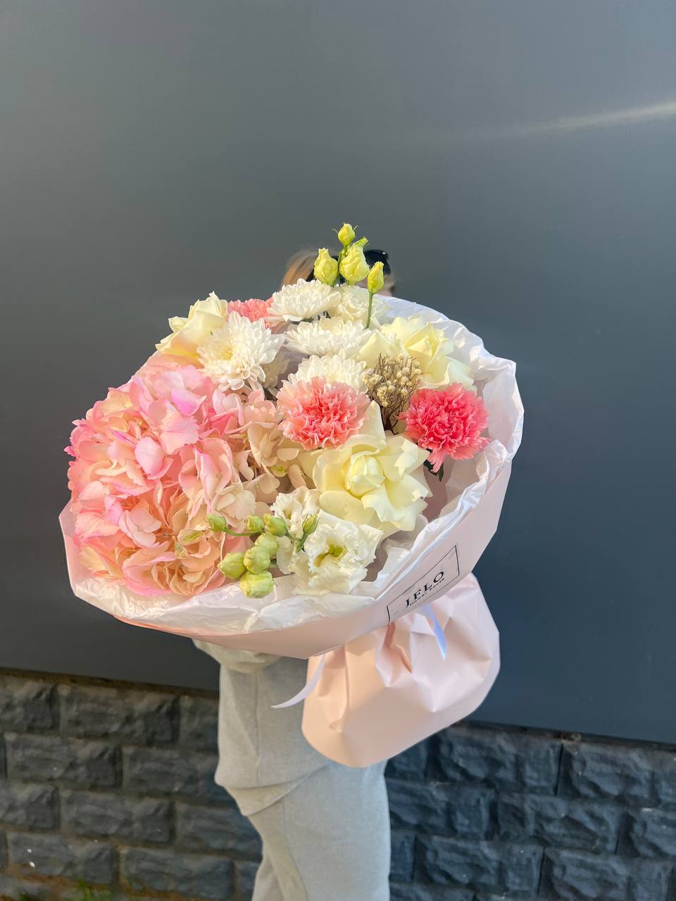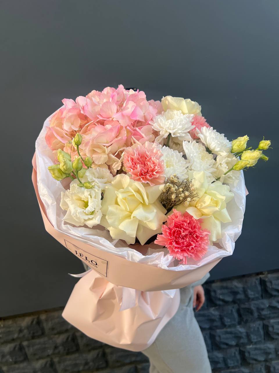 Плотная сборка с пышной гортензией в центре и рассыпчатыми соцветиями диантуса по краям. Эустома добавляет воздушности, а ветки озатамуса создают лёгкую графику. Букет держит форму и выглядит объёмно с любого ракурса.