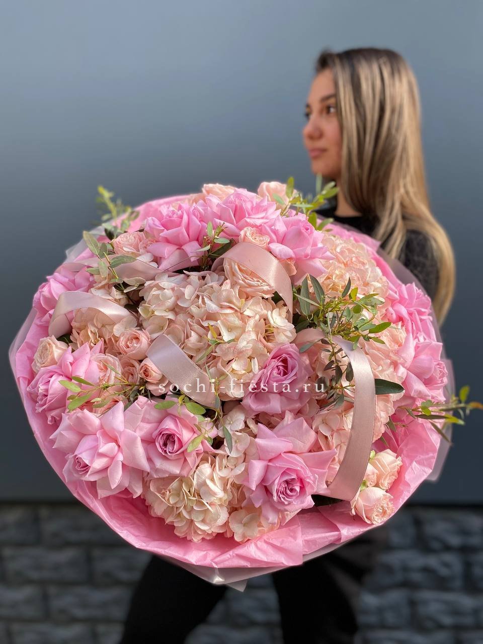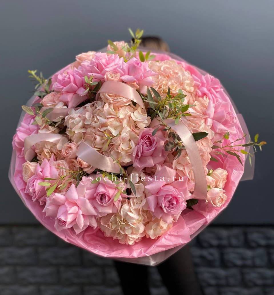 диантус, эустома, гортензия, хайди, эвкалипт, озатамус, пленка.