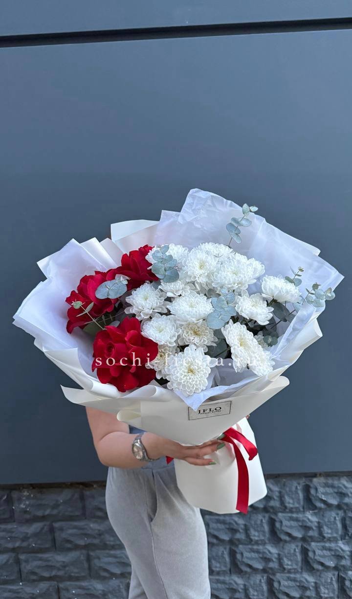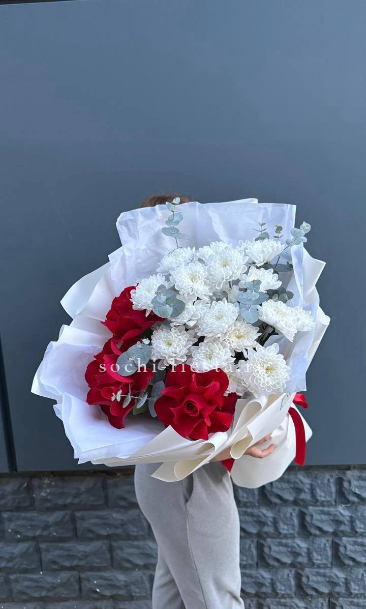 В центре внимания — фактуры и цвет! Современный, стильный букет, который сочетает бархатистые бутоны роз и мягкий хлопок. Это не просто цветы, а целая цветочная композиция для тех, кто ценит красоту в деталях. Отличный повод порадовать себя или близких!
