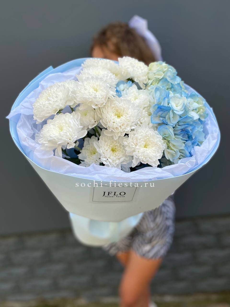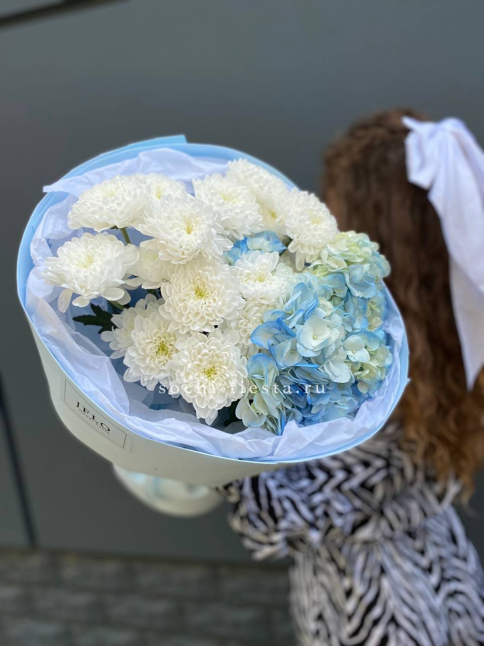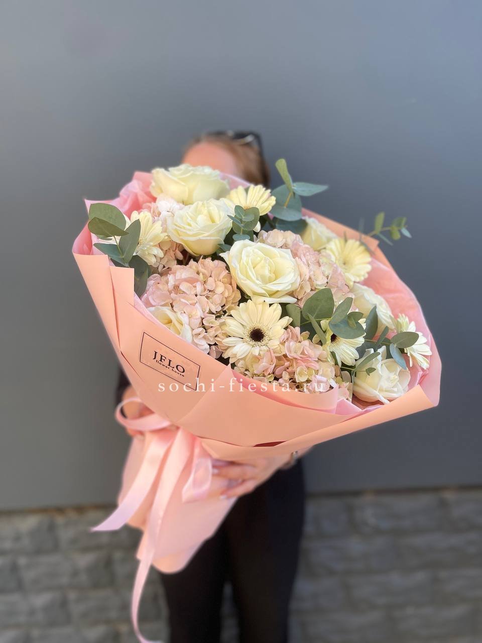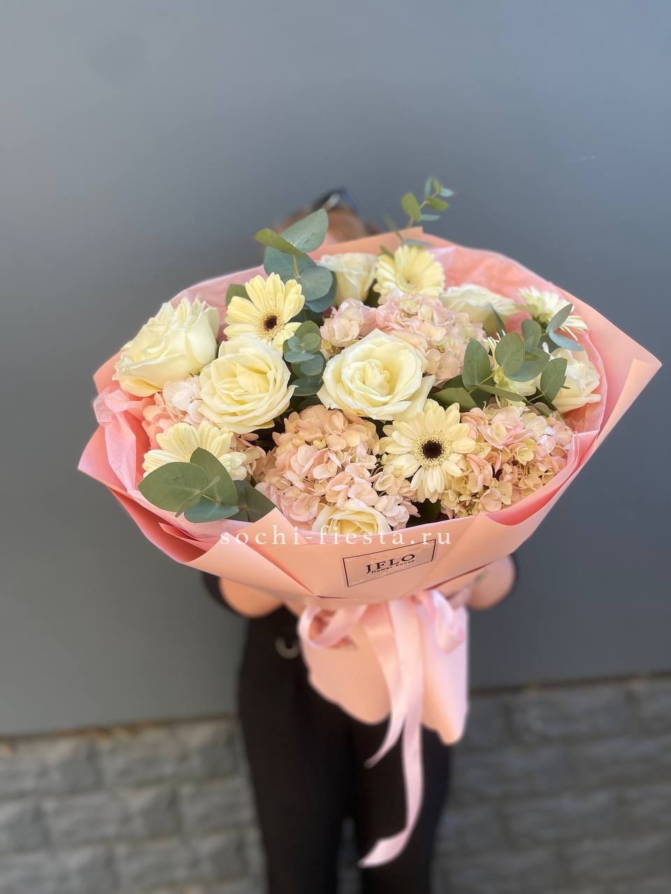 гортензия, диантус, кустовая пионовидная роза, эустома, вспомогательные цветы, эвкалипт, лента, дизайнерская упаковка.