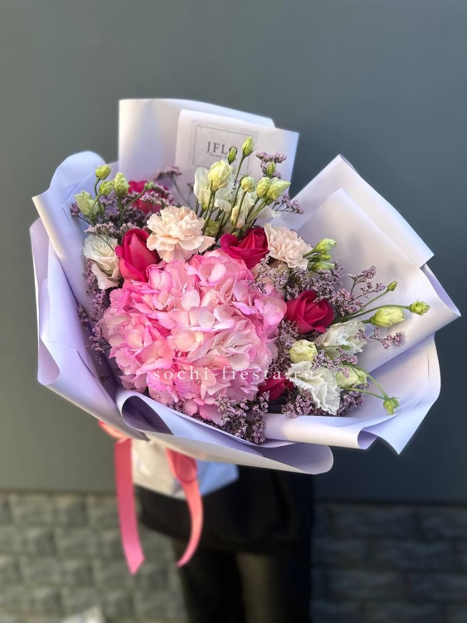 гортензия, гвоздика, статица (или аналог), роза, эустома, дизайнерская пленка, лента.