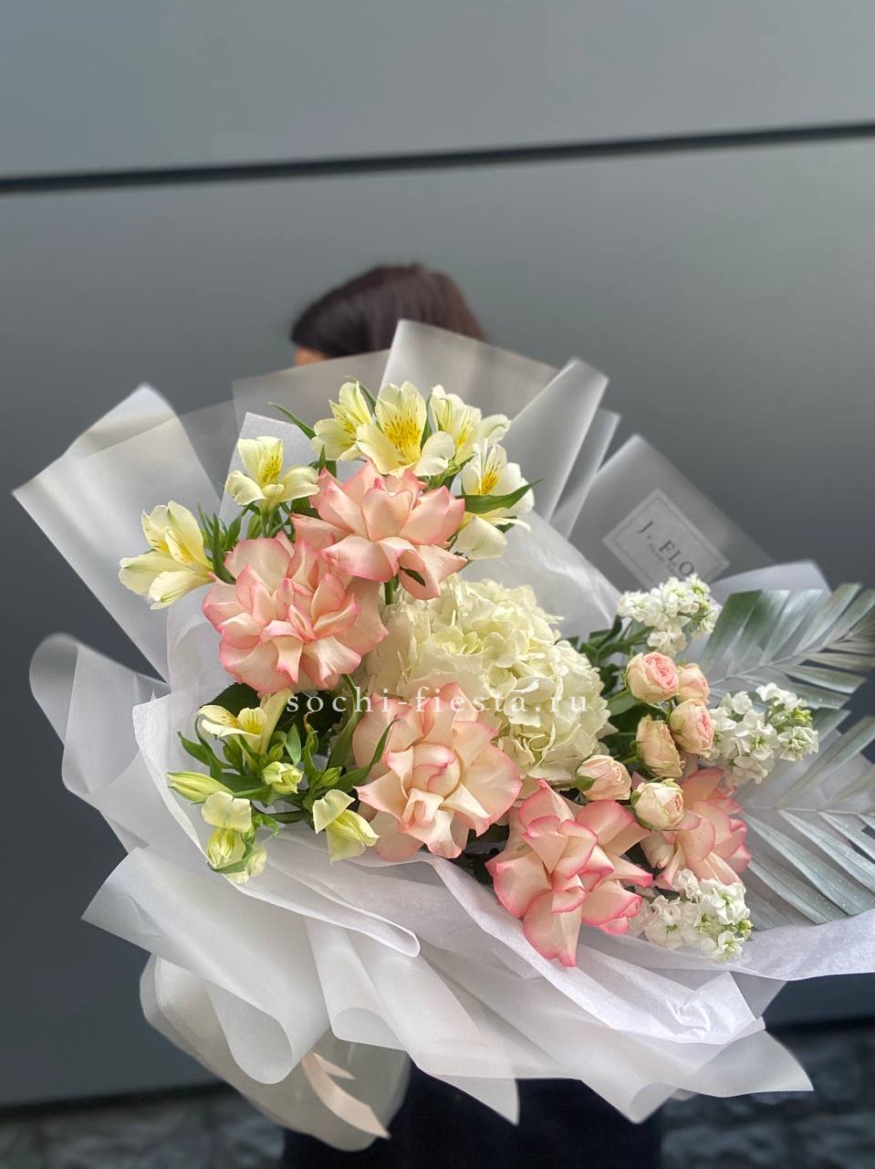 Лёгкая композиция с гортензией и гвоздикой дарит ощущение весеннего утра. Цветы подобраны так, что букет выглядит непринуждённо и свободно.
