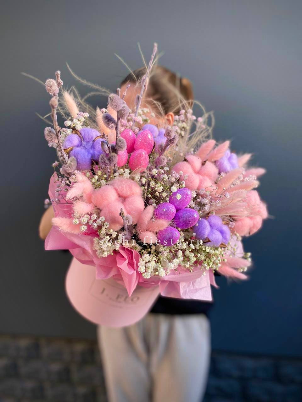 гипсофила, хлопок, верба, ковыль, яйца, лагурус,  тишью, цилиндр D16.