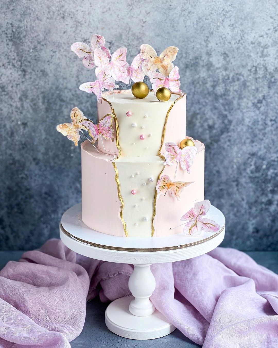 Двухъярусная конструкция с парящими бабочками притягивает взгляд своей лёгкостью. Декор расположен так, что композиция читается со всех сторон. Воздушное оформление создаёт ощущение движения и радости.